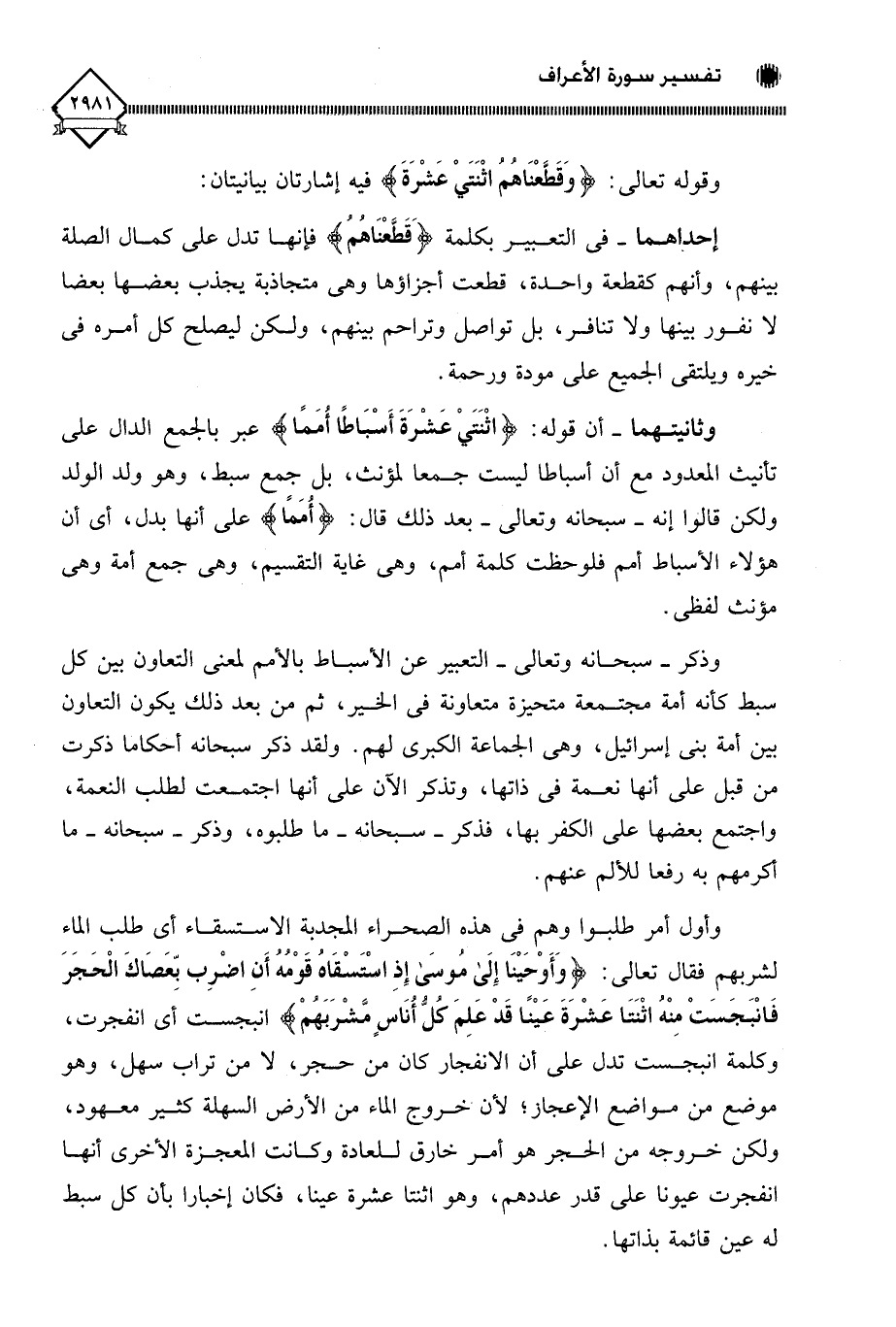 وثانيتهما - أن قوله: (اثْنَتَيْ عَشْرَةَ أَسْبَاطًا أُمَمًا) عبر بالجمع الدال على تأنيث المعدود مع أن أسباطا ليست جمعا لمؤنث، بل جمع سبط، وهو ولد الولد ولكن قالوا إنه - سبحانه وتعالى - بعد ذلك قال: (أُمَمًا) على أنها بدل، أي أن هؤلاء الأسباط أمم فلوحظت كلمة أمم، وهي غاية التقسيم، وهي جمع أمة وهي مؤنث لفظي.