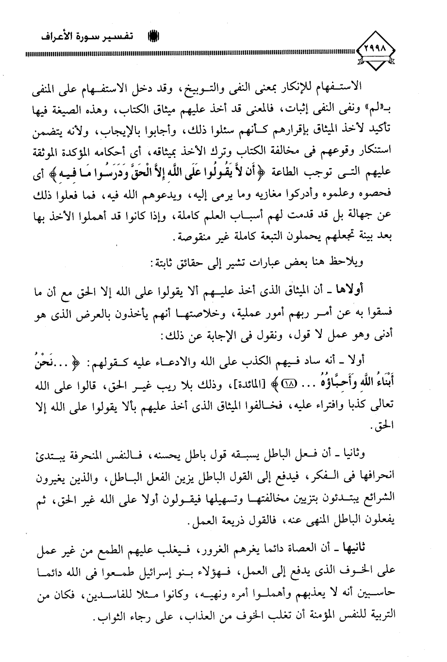 الاستفهام للإنكار بمعنى النفي والتو بيخ، وقد دخل الاستفهام على المنفي بـ " لم " ونفي النفي إثبات، فالمعنى قد أخذ عليهم ميثاق الكتاب، وهذه الصيغة فيها تأكيد لأخذ الميثاق بإقرارهم كأنهم سئلوا ذلك، وأجابوا بالإيجاب، ولأنه يتضمن استنكار وقوعهم في مخالفة الكتاب وترك الأخذ بميثاقه، أي أحكامه المؤكدة الموثقة عليهم التي توجب الطاعة (أَن لَا يَقُولُوا عَلَى اللَّهِ إِلَّا الْحَقَّ وَدَرَسُوا مَا فِيهِ) أي فحصوه وعلموه وأدركوا مغازيه وما يرمي إليه، ويدعوهم الله فيه، فما فعلوا ذلك عن جهالة بل قد قدمت لهم أسباب العلم كاملة، وإذا كانوا قد أهملوا الأخذ بها بعد بينة تجعلهم يحملون التبعة كاملة غير منقوصة.
