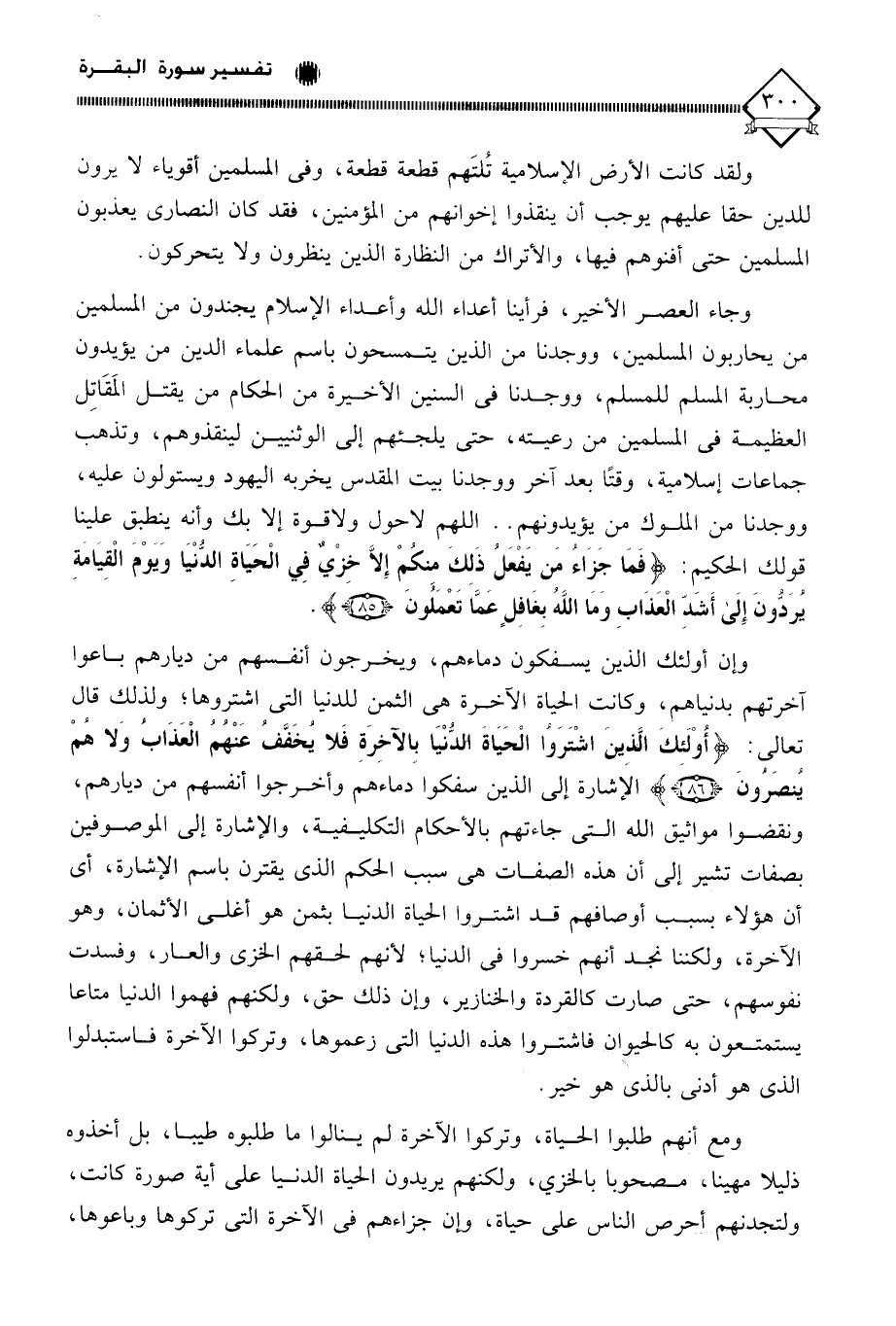 وجاء العصر الأخير، فرأينا أعداء الله وأعداء الإسلام يجندون من المسلمين من يحاربون المسلمين، ووجدنا من الذين يتمسحون باسم علماء الدين من يؤيدون محاربة المسلم للمسلم، ووجدنا في السنين الأخيرة من الحكام من يقتل المَقَاتِل العظيمة في المسلمين من رعيته، حتى يلجئهم إلى الوثنيين لينقذوهم، وتذهب جماعات إسلامية، وقتًا بعد آخر ووجدنا بيت المقدس يخربه اليهود ويستولون عليه، ووجدنا من اللوك من يؤيدونهم. . اللهم لاحول ولا قوة إلا بك وأنه ينطبق علينا قوِلك الحكيم: (فَمَا جَزَاءُ مَنْ يَفْعَلُ ذَلِكَ مِنْكُمْ إِلَّا خِزْيٌ فِي الْحَيَاةِ الدُّنْيَا وَيَوْمَ الْقِيَامَةِ يُرَدُّونَ إِلَى أَشَدِّ الْعَذَابِ وَمَا اللَّهُ بِغَافِلٍ عَمَّا تَعْمَلُونَ).