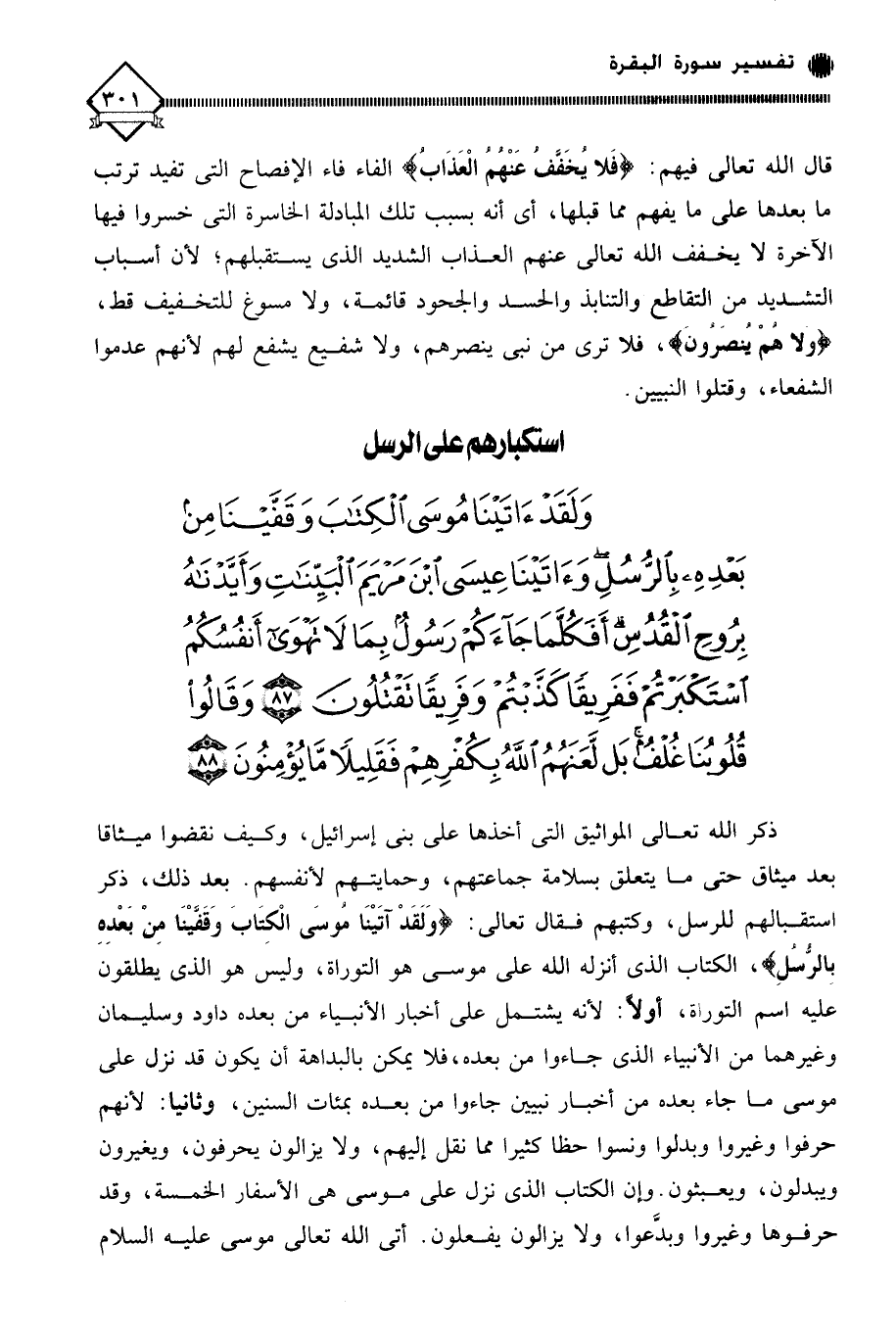 (وَلَقَدْ آتَيْنَا مُوسَى الْكِتَابَ وَقَفَّيْنَا مِنْ بَعْدِهِ بِالرُّسُلِ وَآتَيْنَا عِيسَى ابْنَ مَرْيَمَ الْبَيِّنَاتِ وَأَيَّدْنَاهُ بِرُوحِ الْقُدُسِ أَفَكُلَّمَا جَاءَكُمْ رَسُولٌ بِمَا لَا تَهْوَى أَنْفُسُكُمُ اسْتَكْبَرْتُمْ فَفَرِيقًا كَذَّبْتُمْ وَفَرِيقًا تَقْتُلُونَ (87) وَقَالُوا قُلُوبُنَا غُلْفٌ بَلْ لَعَنَهُمُ اللَّهُ بِكُفْرِهِمْ فَقَلِيلًا مَا يُؤْمِنُونَ (88)