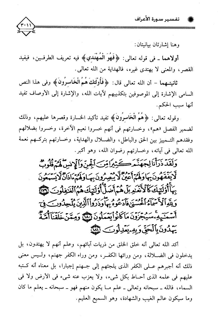 (وَلَقَدْ ذَرَأْنَا لِجَهَنَّمَ كَثِيرًا مِنَ الْجِنِّ وَالْإِنْسِ لَهُمْ قُلُوبٌ لَا يَفْقَهُونَ بِهَا وَلَهُمْ أَعْيُنٌ لَا يُبْصِرُونَ بِهَا وَلَهُمْ آذَانٌ لَا يَسْمَعُونَ بِهَا أُولَئِكَ كَالْأَنْعَامِ بَلْ هُمْ أَضَلُّ أُولَئِكَ هُمُ الْغَافِلُونَ (179) وَلِلَّهِ الْأَسْمَاءُ الْحُسْنَى فَادْعُوهُ بِهَا وَذَرُوا الَّذِينَ يُلْحِدُونَ فِي أَسْمَائِهِ سَيُجْزَوْنَ مَا كَانُوا يَعْمَلُونَ (180) وَمِمَّنْ خَلَقْنَا أُمَّةٌ يَهْدُونَ بِالْحَقِّ وَبِهِ يَعْدِلُونَ (181)