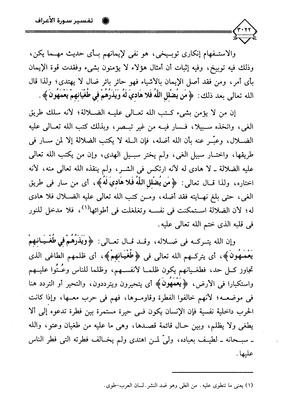وإن الله يتركه في ضلاله، وقد قال تعالى: (وَيَذَرُهُمْ فِي طُغْيَانِهِمْ يَعْمَهُونَ)، أي يتركهم الله تعالى في (طُغْيَانِهِمْ)، أي ظلمهم الطاغي الذي تجاوز كل حد، فطغيانهم يكون ظلما لأنفسهم، وظلما للناس وعُتُوا عليهم واستكبارا في الأرض، (يعْمَهونَ) أي يتحيرون ويترددون، والتحير أو التردد هنا في موضعه؛ لأنهم خالفوا الفطرة وقاوموها، فهم في حرب معها، وإذأكانت الحرب داخلية نفسية فإن الإنسان يكون في حيرة مستمرة بين فطرة تدعوه إلى ألا يطغى ولا يظلم، وبين حال قائمة قصدها، وهي ما عليه من طغيان وعتو، والله - سبحانه - لطيف بعباده، ولي لمن اهتدى ولم يخالف فطرته التي فطر الناس عليها.
