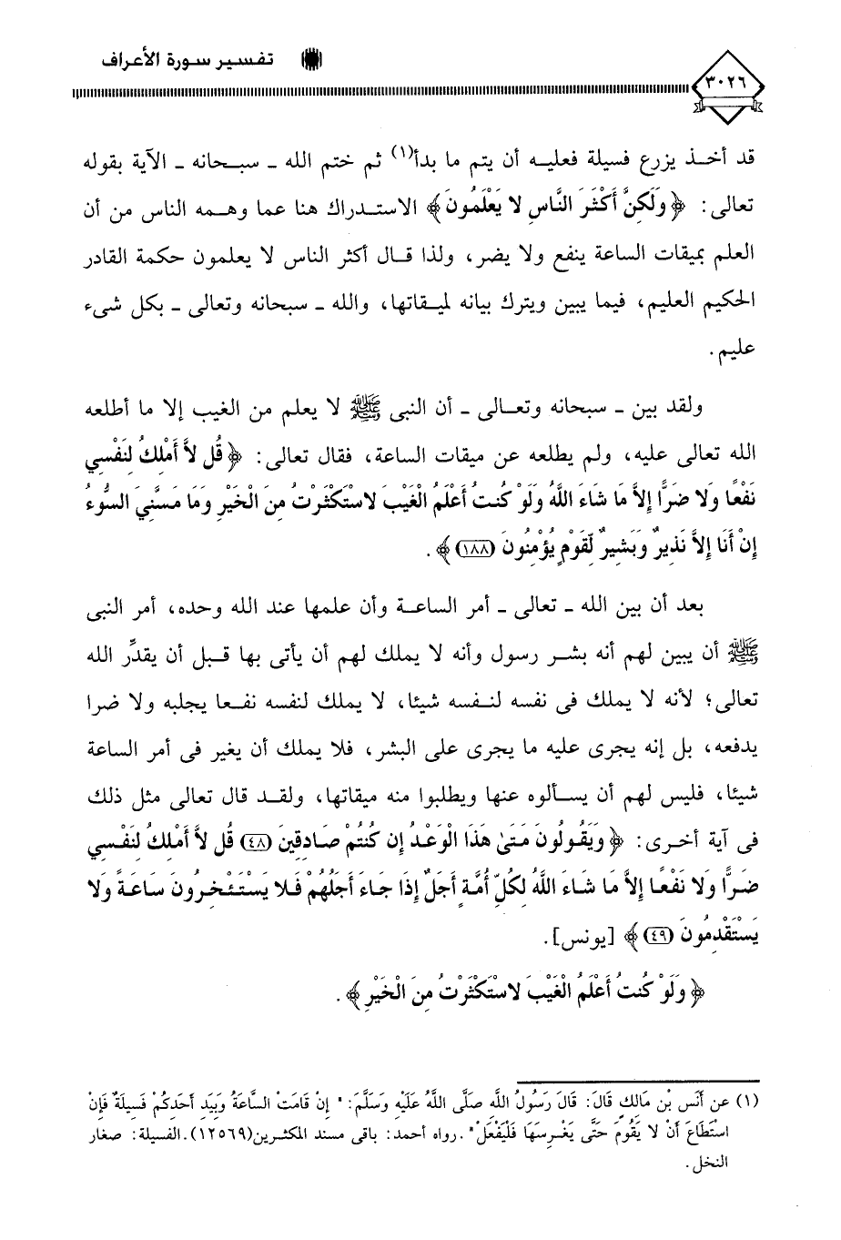 (قُلْ لَا أَمْلِكُ لِنَفْسِي نَفْعًا وَلَا ضَرًّا إِلَّا مَا شَاءَ اللَّهُ وَلَوْ كُنْتُ أَعْلَمُ الْغَيْبَ لَاسْتَكْثَرْتُ مِنَ الْخَيْرِ وَمَا مَسَّنِيَ السُّوءُ إِنْ أَنَا إِلَّا نَذِيرٌ وَبَشِيرٌ لِقَوْمٍ يُؤْمِنُونَ (188)