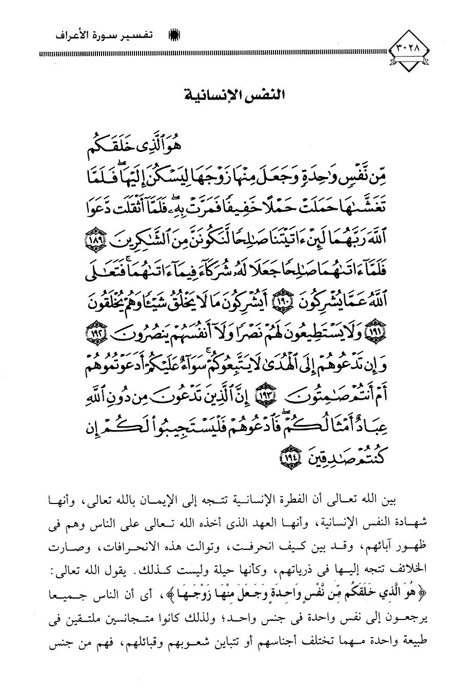 (هُوَ الَّذِي خَلَقَكُمْ مِنْ نَفْسٍ وَاحِدَةٍ وَجَعَلَ مِنْهَا زَوْجَهَا لِيَسْكُنَ إِلَيْهَا فَلَمَّا تَغَشَّاهَا حَمَلَتْ حَمْلًا خَفِيفًا فَمَرَّتْ بِهِ فَلَمَّا أَثْقَلَتْ دَعَوَا اللَّهَ رَبَّهُمَا لَئِنْ آتَيْتَنَا صَالِحًا لَنَكُونَنَّ مِنَ الشَّاكِرِينَ (189) فَلَمَّا آتَاهُمَا صَالِحًا جَعَلَا لَهُ شُرَكَاءَ فِيمَا آتَاهُمَا فَتَعَالَى اللَّهُ عَمَّا يُشْرِكُونَ (190) أَيُشْرِكُونَ مَا لَا يَخْلُقُ شَيْئًا وَهُمْ يُخْلَقُونَ (191) وَلَا يَسْتَطِيعُونَ لَهُمْ نَصْرًا وَلَا أَنْفُسَهُمْ يَنْصُرُونَ (192) وَإِنْ تَدْعُوهُمْ إِلَى الْهُدَى لَا يَتَّبِعُوكُمْ سَوَاءٌ عَلَيْكُمْ أَدَعَوْتُمُوهُمْ أَمْ أَنْتُمْ صَامِتُونَ (193) إِنَّ الَّذِينَ تَدْعُونَ مِنْ دُونِ اللَّهِ عِبَادٌ أَمْثَالُكُمْ فَادْعُوهُمْ فَلْيَسْتَجِيبُوا لَكُمْ إِنْ كُنْتُمْ صَادِقِينَ (194)