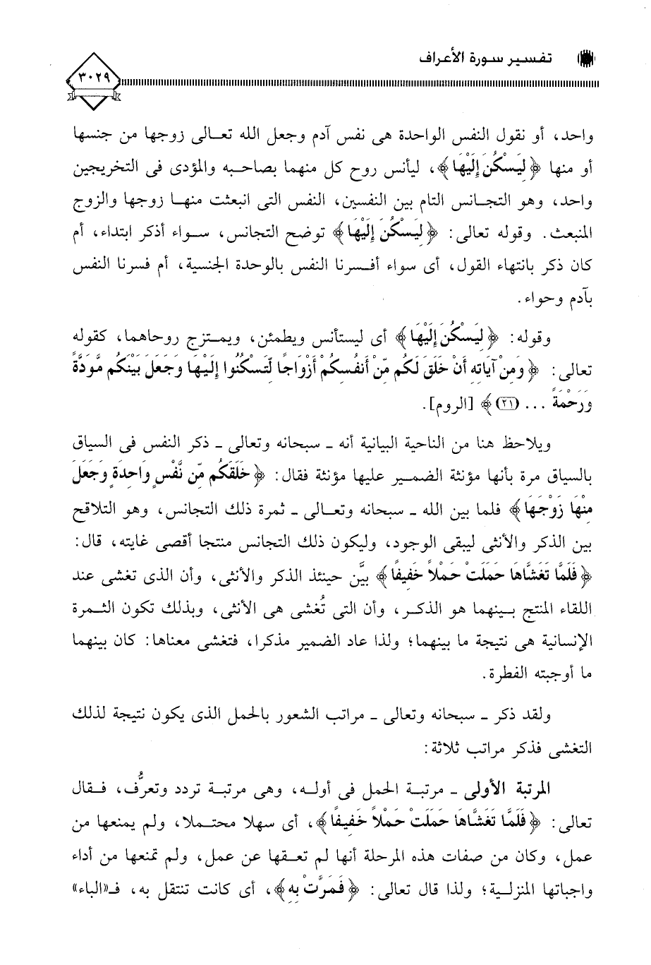 واحد، أو نقول النفس الواحدة هي نفس آدم وجعل الله تعالى زوجها من جنسها أو منها (لِيَسْكُنَ إِلَيْهَا)، ليأنس روح كل منهما بصاحبه والمؤدى في التخريجين واحد، وهو التجانس التام بين النفسين، النفس التي انبعثت منها زوجهما والزوج المنبعث. وقوله تعالى: (لِيَسْكُنَ إِلَيْهَا) توضح التجانس، سواء أذكر ابتداء، أم كان ذكر بانتهاء القول، أي سواء أفسرنا النفس بالوحدة الجنسية، أم فسرنا النفس بآدم وحواء.