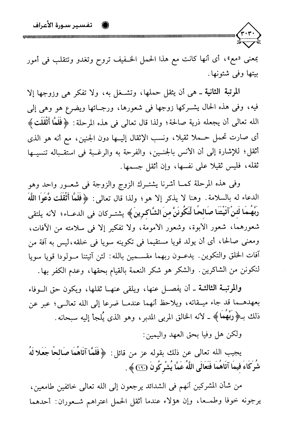 المرتبة الثانية - هي أن يثقل حملها، وتشغل به، ولا تفكر هي وزوجها إلا فيه، وفي هذه الحال يشركها زوجها في شعورها، ورجائها ويضرع هو وهي إلى الله تعالى أن يجعله ذرية صالحة؛ ولذا قال تعالى في هذه المرحلة: (فَلَمَّا أَثْقَلَت) أي صارت تحمل حملا ثقيلا، ونسب الإثقال إليها دون الجنين، مع أنه هو الذي أثقل؛ للإشارة إلى أن الأنس بالجنين، والفرحة به والرغبة في استقباله تنسيها ثقله، فليس ثقيلا على نفسها، وإن أثقل جسمها.