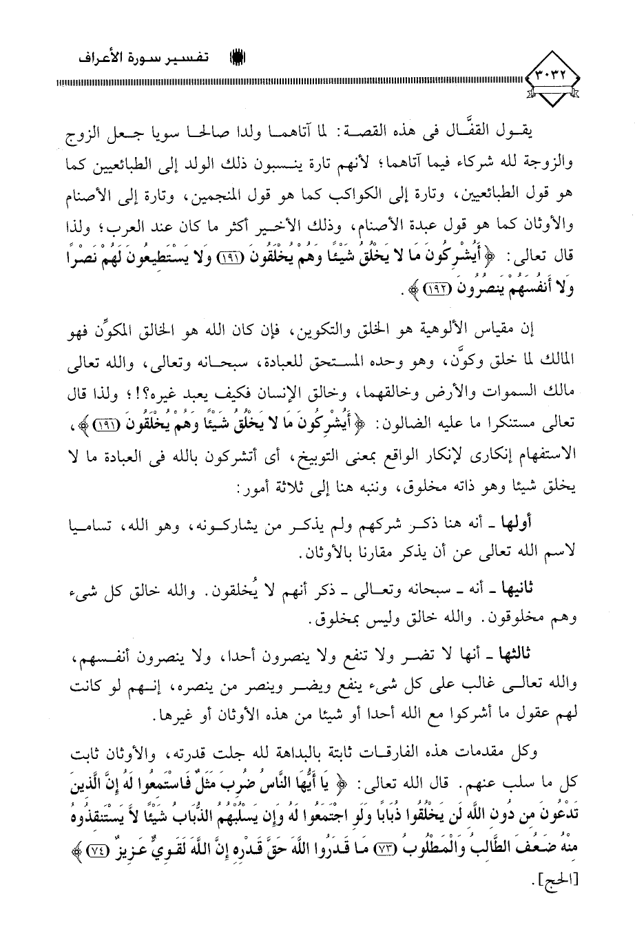يقول القفَّال في هذه القصة: لما آتاهما ولدا صالحا سويا جعل الزوج والزوجة لله شركاء فيما آتاهما؛ لأنهم تارة ينسبون ذلك الولد إلى الطبائعيين كما هو قول الطبائعيين، وتارة إلى الكواكب كما هو قول المنجمين، وتارة إلى الأصنام والأوثان كما هو قول عبدة الأصنام، وذلك الأخير أكثر ما كان عند العرب؛ ولذا قال تعالى: (أَيُشْرِكُونَ مَا لَا يَخْلُقُ شَيْئًا وَهُمْ يُخْلَقُونَ (191) وَلَا يَسْتَطِيعُونَ لَهُمْ نَصْرًا وَلَا أَنْفُسَهُمْ يَنْصُرُونَ (192).