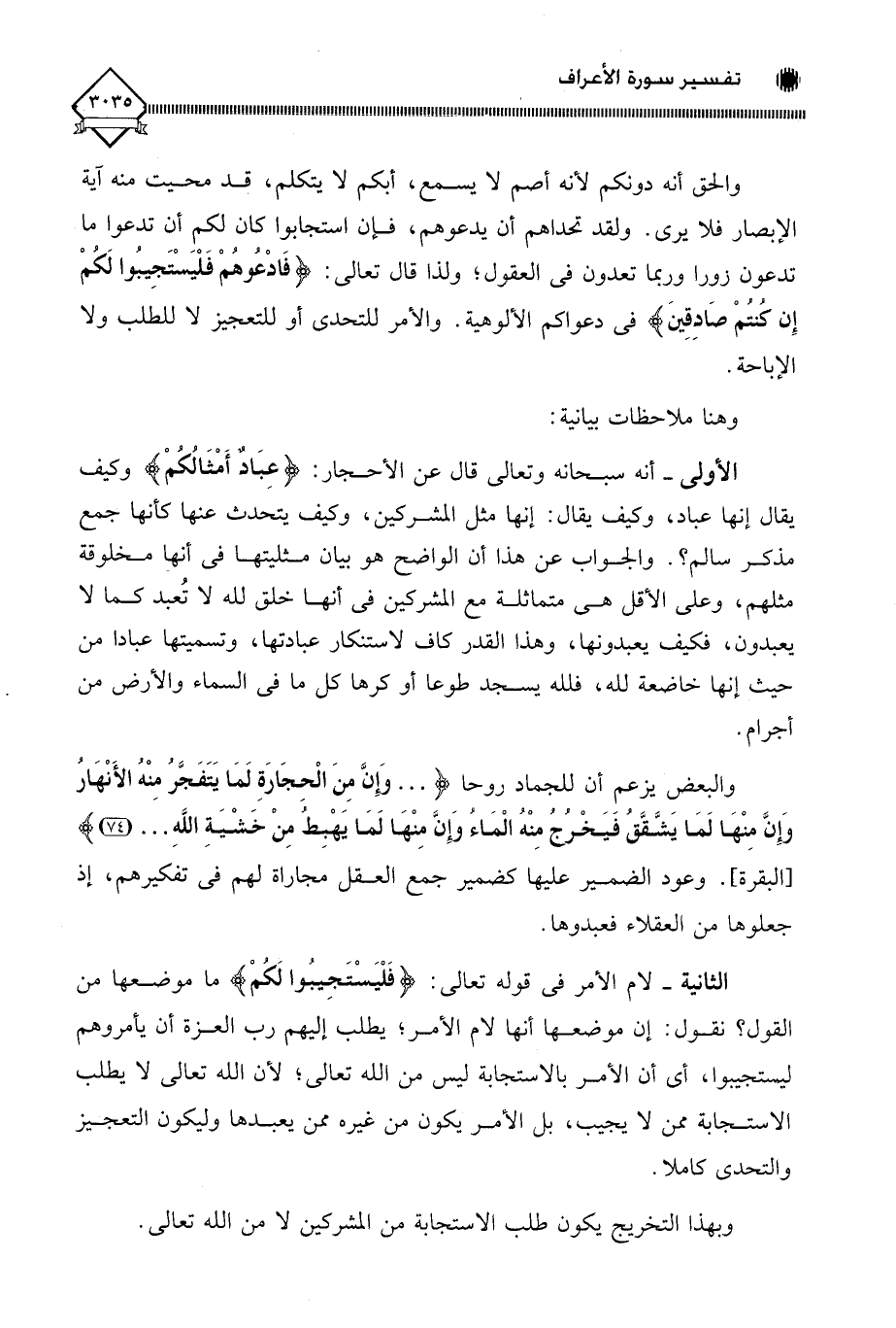 الأولى - أنه سبحانه وتعالى قال عن الأحجار: (عِبَادٌ أَمْثَالُكُمْ) وكيف يقال إنها عباد، وكيف يقال: إنها مثل المشركين، وكيف يتحدث عنها كأنها جمع مذكر سالم؟. والجواب عن هذا أن الواضح هو بيان مثليتها في أنها مخلوقة مثلهم، وعلى الأقل هي متماثلة مع المشركين في أنها خلق لله لَا تُعبد كما لا يعبدون، فكيف يعبدونها، وهذا القدر كاف لاستنكار عبادتها، وتسميتها عبادا من حيث إنها خاضعة لله، فلله يسجد طوعا أو كرها كل ما في السماء والأرض من أجرام.