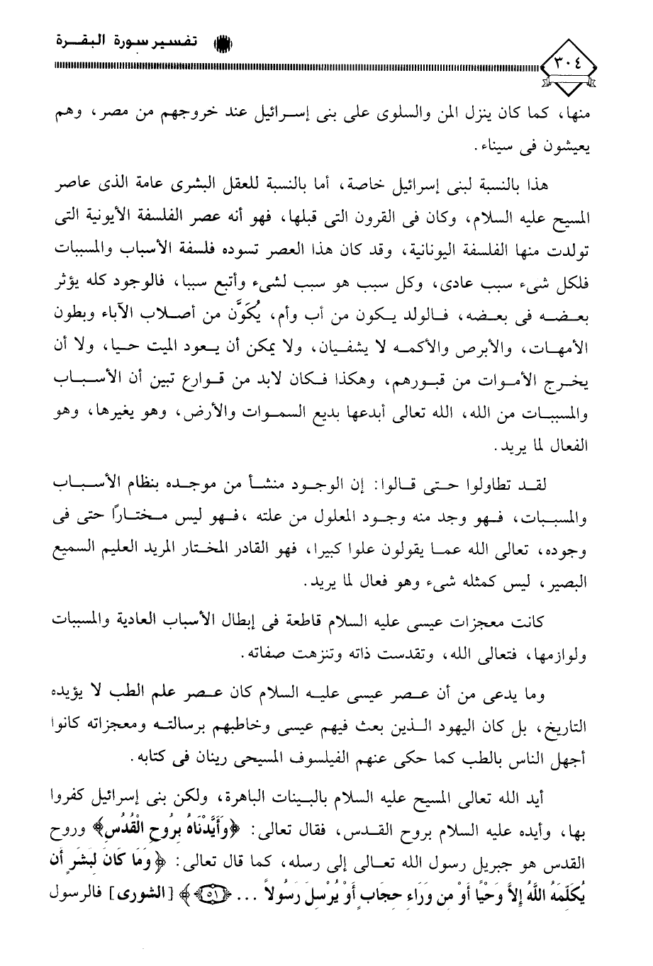 هذا بالنسبة لبني إسرائيل خاصة، أما بالنسبة للعقل البشرى عامة الذي عاصر المسيح عليه السلام، وكان في القرون التي قبلها، فهو أنه عصر الفلسفة الأيونية التي تولدت منها الفلسفة اليونانية، وقد كان هذا العصر تسوده فلسفة الأسباب والمسببات فلكل شيء سبب عادى، وكل سبب هو سبب لشيء وأتبع سببا، فالوجود كله يؤثر بعضه في بعضه، فالولد يكون من أب وأم، يكَوَّن من أصلاب الآباء وبطون الأمهات، والأبرص والأكمه لَا يشفيان، ولا يمكن أن يعود الميت حيا، ولا أن يخرج الأموات من قبورهم، وهكذا فكان لابد من قوارع تبين أن الأسباب والمسببات من الله، الله تعالى أبدعها بديع السماوات والأرض، وهو يغيرها، وهو الفعال لَا يريد.