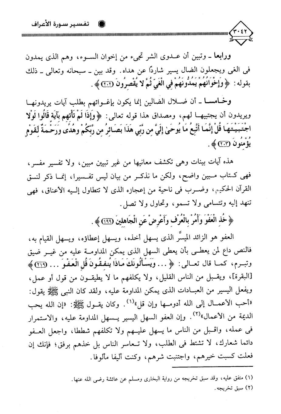 العفو هو الزائد الميسَّر الذي يسهل أخذه، ويسهل إعطاؤه، ويسهل القيام به، فالنص داع لمن يعطي بأن يعطي السهل الذي يمكن المداومة عليه من غير ضيق وتبرم، كما قال تعالى: (. . . وَيَسْألُونَكَ مَاذَا يُنفِقُونَ قُلِ الْعَفْوَ. . .)، ويقبل من الناس القليل، ولا يكلفهم ما لَا يطيقون من قول أو عمل، ويفعل اليسير من العبادات الذي يمكن المداومة عليه، ولقد كان النبي - صلى الله عليه وسلم - يقول: " أحب الأعمال إلى الله أدومها وإن قلَّ " (¬1). وكان يقول - صلى الله عليه وسلم -: " إن الله يحب الديمة من الأعمال " (¬2). وإن العفو السهل اليسير يسهل المداومة عليه، والاستمرار في عمله، واقبل من الناس ما يسهل عليهم ولا تكلفهم شططا، واجعل العفو دائما شعارك، لَا تشتط في الطلب، ولا تعاسر الناس بل خذهم برفق؛ فإنك إن فعلت كسبت خيرهم، واجتنبت شرهم، وكنت أليفا مألوفا.