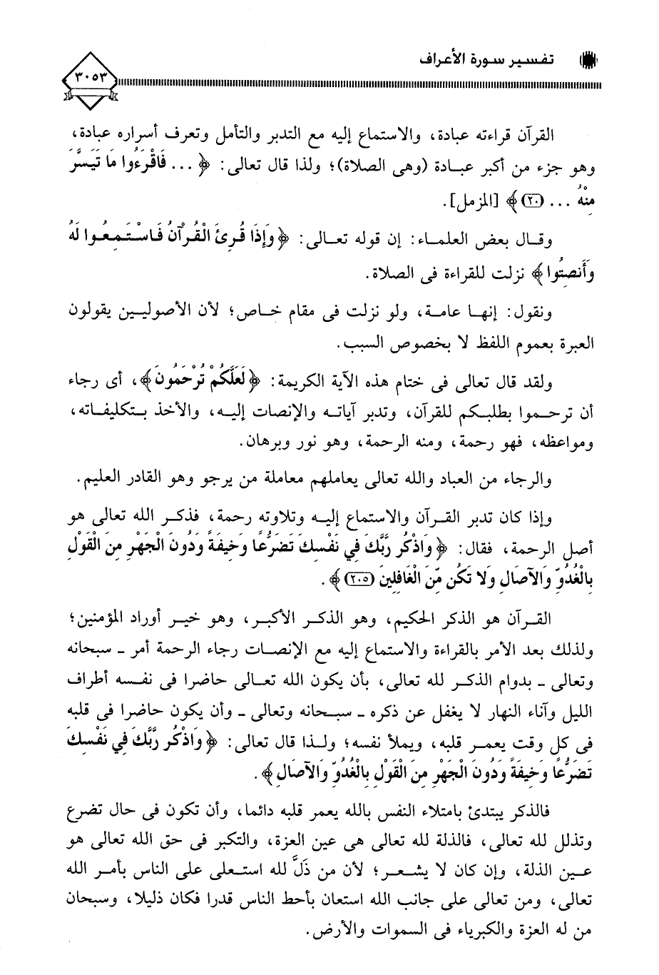 القرآن هو الذكر الحكيم، وهو الذكر الأكبر، وهو خير أوراد المؤمنين؛ ولذلك بعد الأمر بالقراءة والاستماع إليه مع الإنصات رجاء الرحمة أمر - سبحانه وتعالى - بدوام الذكر لله تعالى، بأن يكون الله تعالى حاضرا في نفسه أطراف الليل وآناء النهار لَا يغفل عن ذكره - سبحانه وتعالى - وأن يكون حاضرا في قلبه فى كل وقت يعمر قلبه، ويملأ نفسه؛ ولذا قال تعالى: (وَاذْكُرْ رَبَّكَ فِي نَفْسِكَ تَضَرُّعًا وَخِيفَةً وَدُونَ الْجَهْرِ مِنَ الْقَوْلِ بِالْغُدُوِّ وَالْآصَالِ).