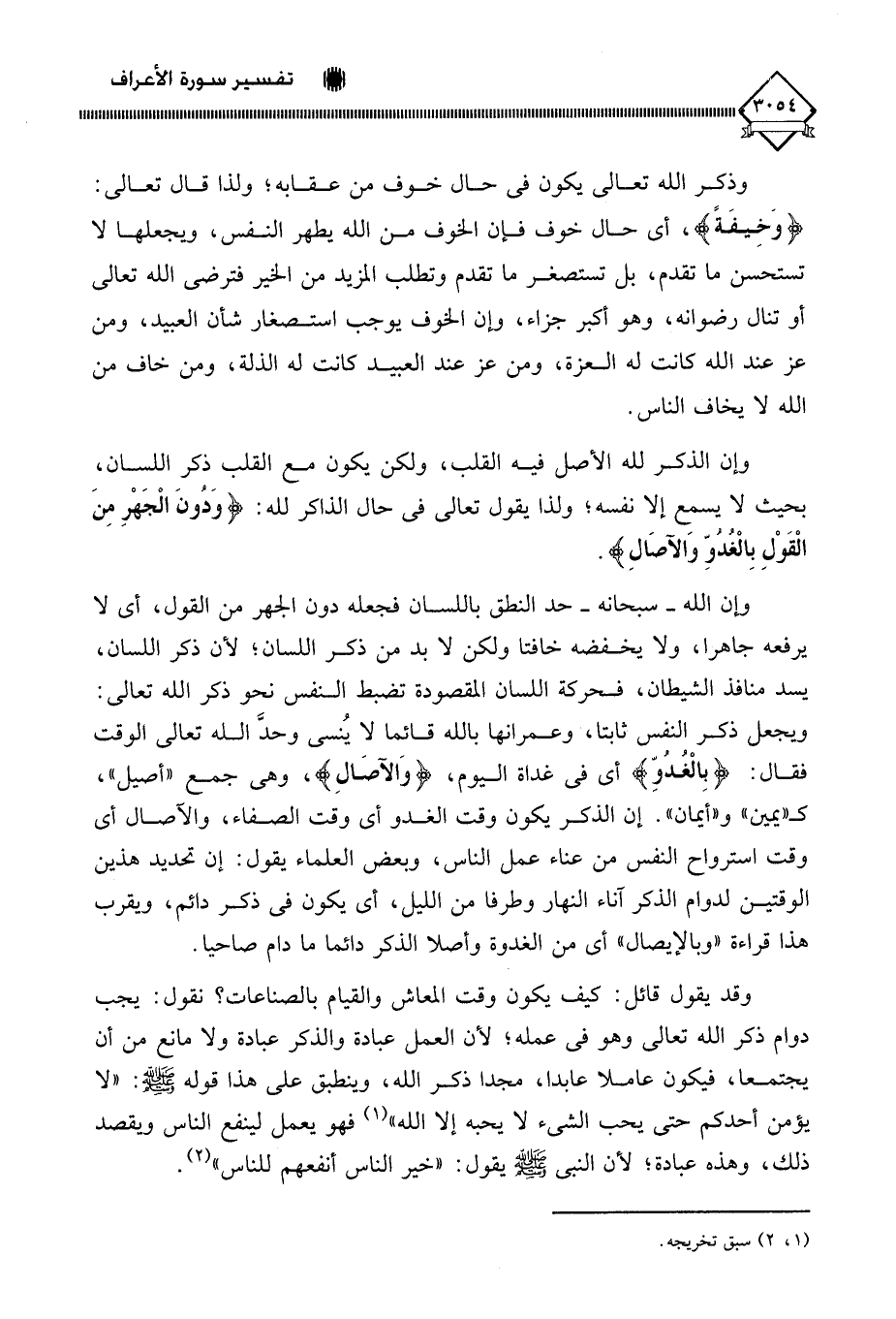 وقد يقول قائل: كيف يكون وقت المعاش والقيام بالصناعات؛ نقول: يجب دوام ذكر الله تعالى وهو في عمله؛ لأن العمل عبادة والذكر عبادة ولا مانع من أن يجتمعا، فيكون عاملا عابدا، مجدا ذكر الله، وينطبق على هذا قوله - صلى الله عليه وسلم -: " لا يؤمن أحدكم حتى يحب الشيء لَا يحبه إلا الله " (¬1) فهو يعمل لينفع الناس ويقصد ذلك، وهذه عبادة؛ لأن النبي - صلى الله عليه وسلم - يقول: " خير الناس أنفعهم للناس " (¬2).