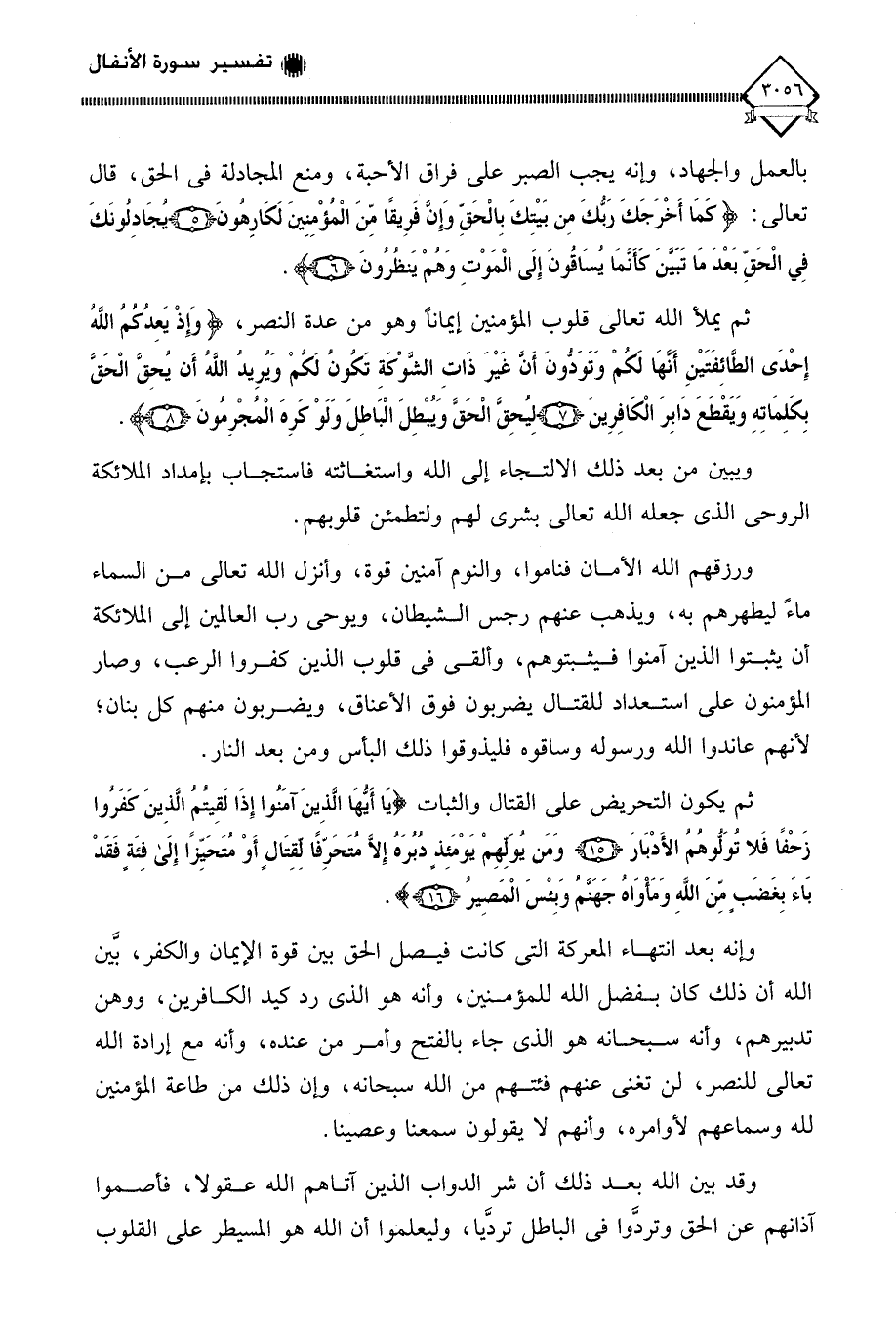 بالعمل والجهاد، وإنه يجب الصبر على فراق الأحبة، ومنع المجادلة في الحق، قال تعالى: (كَمَا أَخْرَجَكَ رَبُّكَ مِنْ بَيْتِكَ بِالْحَقِّ وَإِنَّ فَرِيقًا مِنَ الْمُؤْمِنِينَ لَكَارِهُونَ (5) يُجَادِلُونَكَ فِي الْحَقِّ بَعْدَمَا تَبَيَّنَ كَأَنَّمَا يُسَاقُونَ إِلَى الْمَوْتِ وَهُمْ يَنْظُرُونَ (6)