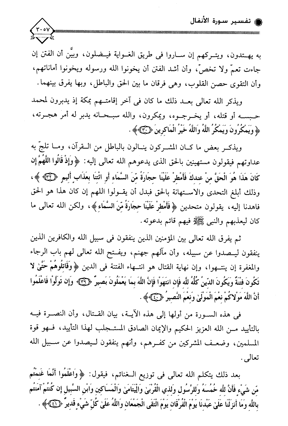 بعد ذلك يتكلم الله تعالى في توزيع الغنائم، فيقول: (وَاعْلَمُوا أَنَّمَا غَنِمْتُمْ مِنْ شَيْءٍ فَأَنَّ لِلَّهِ خُمُسَهُ وَلِلرَّسُولِ وَلِذِي الْقُرْبَى وَالْيَتَامَى وَالْمَسَاكِينِ وَابْنِ السَّبِيلِ إِنْ كُنْتُمْ آمَنْتُمْ بِاللَّهِ وَمَا أَنْزَلْنَا عَلَى عَبْدِنَا يَوْمَ الْفُرْقَانِ يَوْمَ الْتَقَى الْجَمْعَانِ وَاللَّهُ عَلَى كُلِّ شَيْءٍ قَدِيرٌ (41).