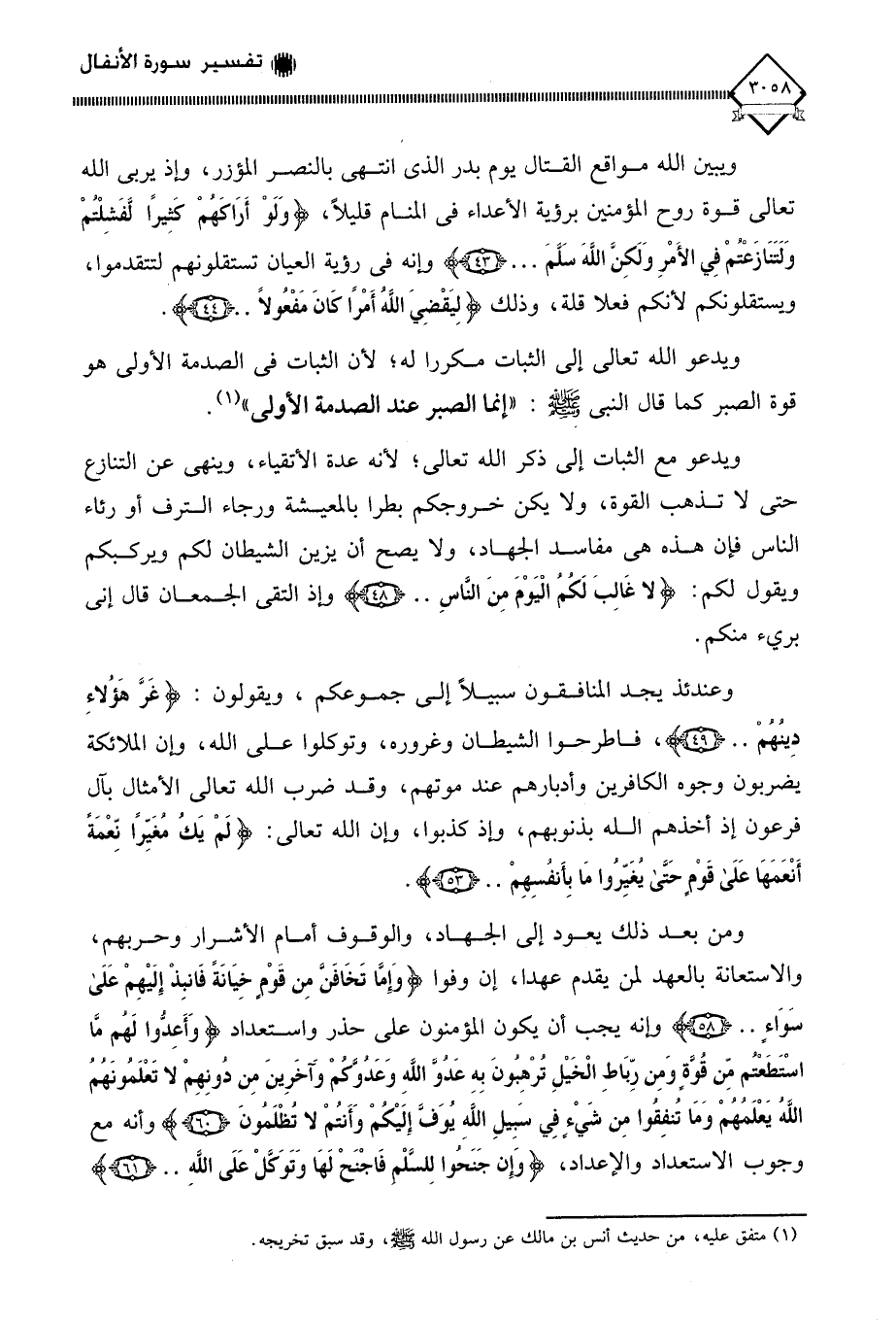 ويبين الله مواقع القتال يوم بدر الذي انتهى بالنصر المؤزر، وإذ يربي الله تعالى قوة روح المؤمنين برؤية الأعداء في المنام قليلًا، (وَلَوْ أَرَاكهُمْ كثِيرًا لَّفَشِلْتُمْ وَلَتَنَازَعْتُمْ فِي الأَمْرِ وَلَكِنَّ اللَّهَ سَلَّمَ. . .) وإنه في رؤية العيان تستقلونهم لتتقدموا، ويستقلونكم لأنكم فعلا قلة، وذلك (لِيَقْضِيَ اللَّهُ أَمْرًا كَانَ مَفْعُولًا. .).