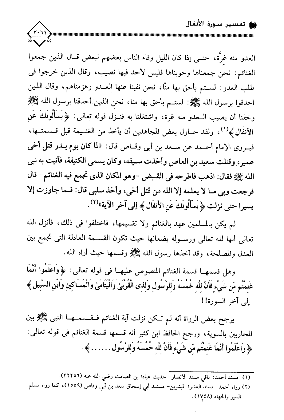 الْعَدُوُّ مِنْهُ غِرَّةً حَتَّى إِذَا كَانَ اللَّيْلُ، وَفَاءَ النَّاسُ بَعْضُهُمْ إِلَى بَعْضٍ قَالَ الَّذِينَ جَمَعُوا الْغَنَائِمَ: نَحْنُ حَوَيْنَاهَا وَجَمَعْنَاهَا فَلَيْسَ لِأَحَدٍ فِيهَا نَصِيبٌ. وَقَالَ الَّذِينَ خَرَجُوا فِي طَلَبِ الْعَدُوِّ: لَسْتُمْ بِأَحَقَّ بِهَا مِنَّا نَحْنُ نَفَيْنَا عَنْهَا الْعَدُوَّ وَهَزَمْنَاهُمْ. وَقَالَ الَّذِينَ أَحْدَقُوا بِرَسُولِ اللهِ صَلَّى اللهُ عَلَيْهِ وَسَلَّمَ: لَسْتُمْ بِأَحَقَّ بِهَا مِنَّا نَحْنُ أَحْدَقْنَا بِرَسُولِ اللهِ صَلَّى اللهُ عَلَيْهِ وَسَلَّمَ، وَخِفْنَا أَنْ يُصِيبَ الْعَدُوُّ مِنْهُ غِرَّةً وَاشْتَغَلْنَا بِهِ، فَنَزَلَتْ: {يَسْأَلُونَكَ عَنِ الْأَنْفَالِ} (¬1)، ولقد حاول بعض المجاهدين أن يأخذ من الغنيمة قبل قسمتها، فيروي الإمام أحمد عَنْ سَعْدِ بْنِ أَبِي وَقَّاصٍ، قَالَ: لَمَّا كَانَ يَوْمُ بَدْرٍ قُتِلَ أَخِي عُمَيْرٌ، وَقَتَلْتُ سَعِيدَ بْنَ الْعَاصِ، وَأَخَذْتُ سَيْفَهُ، وَكَانَ يُسَمَّى ذَا الْكَتِيفَةِ، فَأَتَيْتُ بِهِ نَبِيَّ اللهِ صَلَّى اللهُ عَلَيْهِ وَسَلَّمَ قَالَ: " اذْهَبْ فَاطْرَحْهُ فِي الْقَبَضِ " قَالَ: فَرَجَعْتُ وَبِي مَا لَا يَعْلَمُهُ إِلا اللهُ مِنْ قَتْلِ أَخِي، وَأَخْذِ سَلَبِي، قَالَ: فَمَا جَاوَزْتُ إِلا يَسِيرًا حَتَّى نَزَلَتْ سُورَةُ الْأَنْفَالِ " إلى آخر الآية " (¬2).