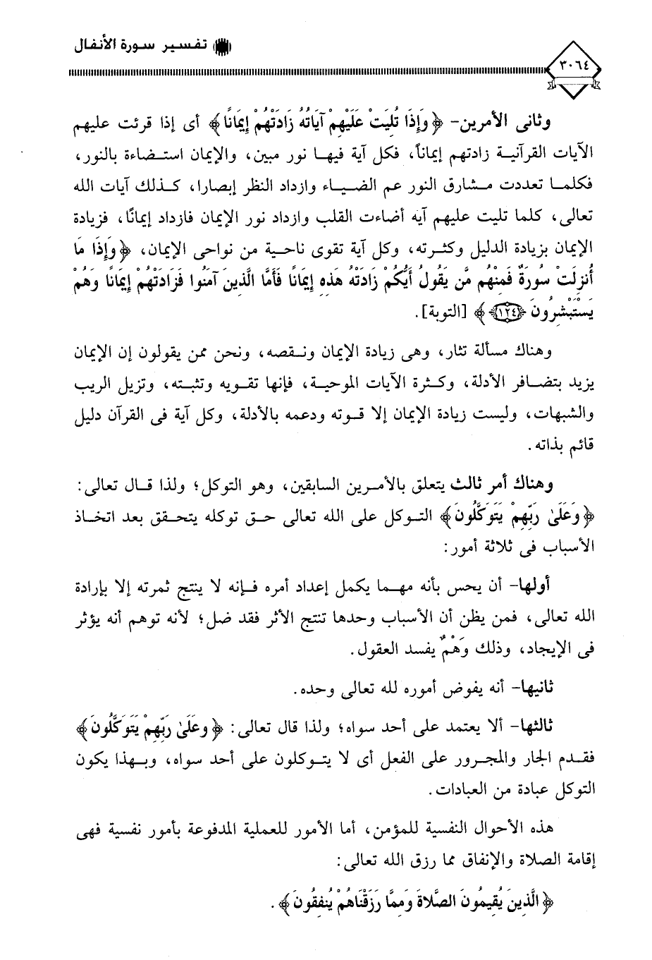 وثاني الأمرين - (وَإذَا تُلِيَتْ عَلَيْهِمْ آيَاتُهُ زَادَتْهُمْ إِيمَانًا) أي إذا قرئت عليهم الآيات القرآنية زادتهم إيمانا، فكل آية فيها نور مبين، والإيمان استضاءة بالنور، فكلما تعددت مشارق النور عم الضياء وازداد النظر إبصارا، كذلك آيات الله تعالى، كلما تليت عليهم آيه أضاءت القلب وازداد نور الإيمان فازداد إيمانًا، فزيادة الإيمان بزيادة الدليل وكثرته، وكل آية تقوى ناحية من نواحي الإيمان، (وَإِذَا مَا أُنْزِلَتْ سُورَةٌ فَمِنْهُمْ مَنْ يَقُولُ أَيُّكُمْ زَادَتْهُ هَذِهِ إِيمَانًا فَأَمَّا الَّذِينَ آمَنُوا فَزَادَتْهُمْ إِيمَانًا وَهُمْ يَسْتَبْشِرُونَ (124).