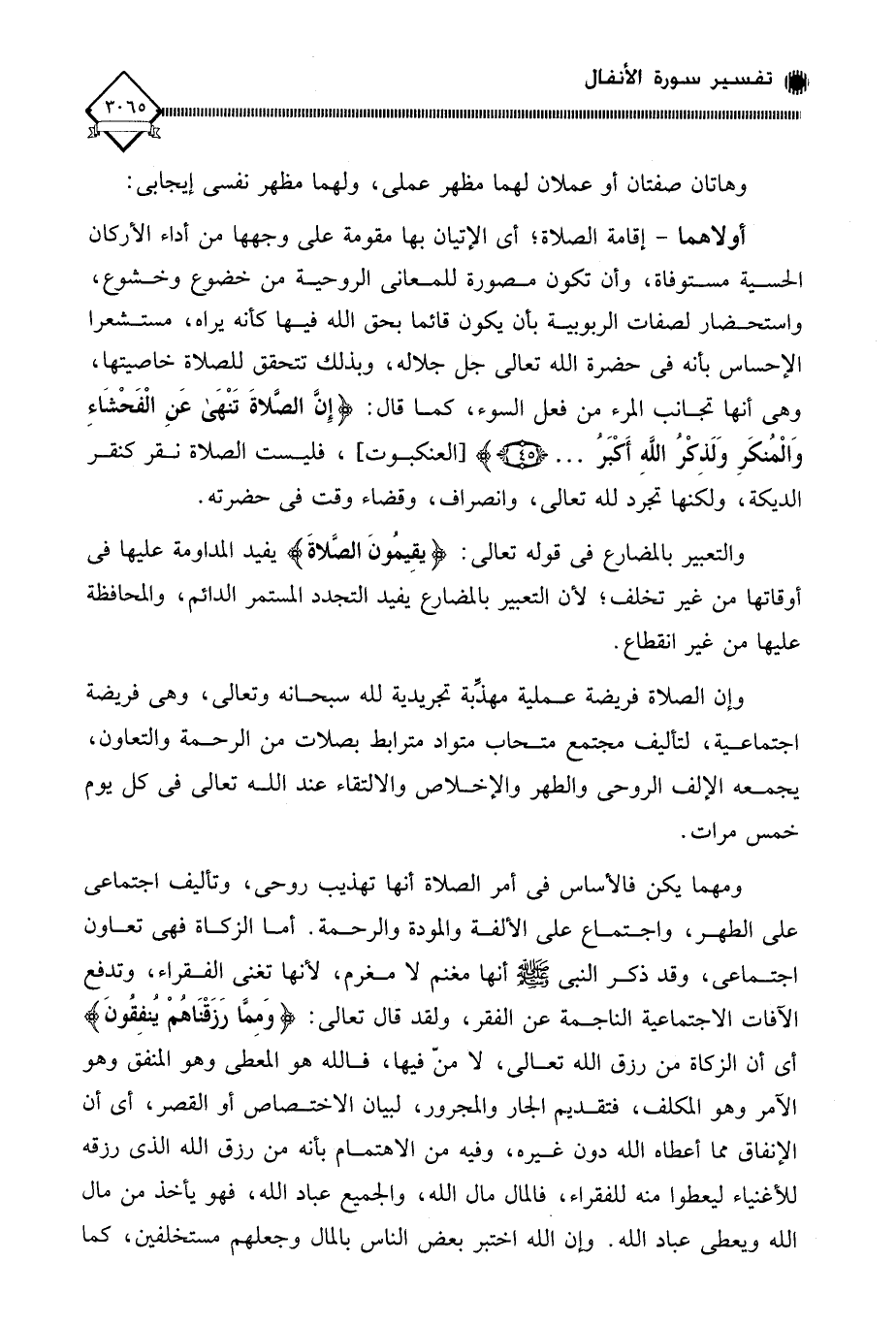 وهاتان صفتان أو عملان لهما مظهر عملي، ولهما مظهر نفسي إيجابي: أولاهما - إقامة الصلاة؛ أي الإتيان بها مقومة على وجهها من أداء الأركان الحسية مستوفاة، وأن تكون مصورة للمعاني الروحية من خضوع وخشوع، واستحضار لصفات الربوبية بأن يكون قائما بحق الله فيها كأنه يراه، مستشعرا الإحساس بأنه في حضرة الله تعالى جل جلاله، وبذلك تتحقق للصلاة خاصيتها، وهي أنها تجانب المرء من فعل السوء، كما قال: (إِنَّ الصَّلاةَ تَنْهَى عَنِ الْفَحْشَاءِ وَالْمُنكَرِ وَلَذِكْرُ اللَّهِ أَكْبَرُ. . .)، فليست الصلاة نقر كنقر الديكة، ولكنها تجرد لله تعالى، وانصراف، وقضاء وقت في حضرته.