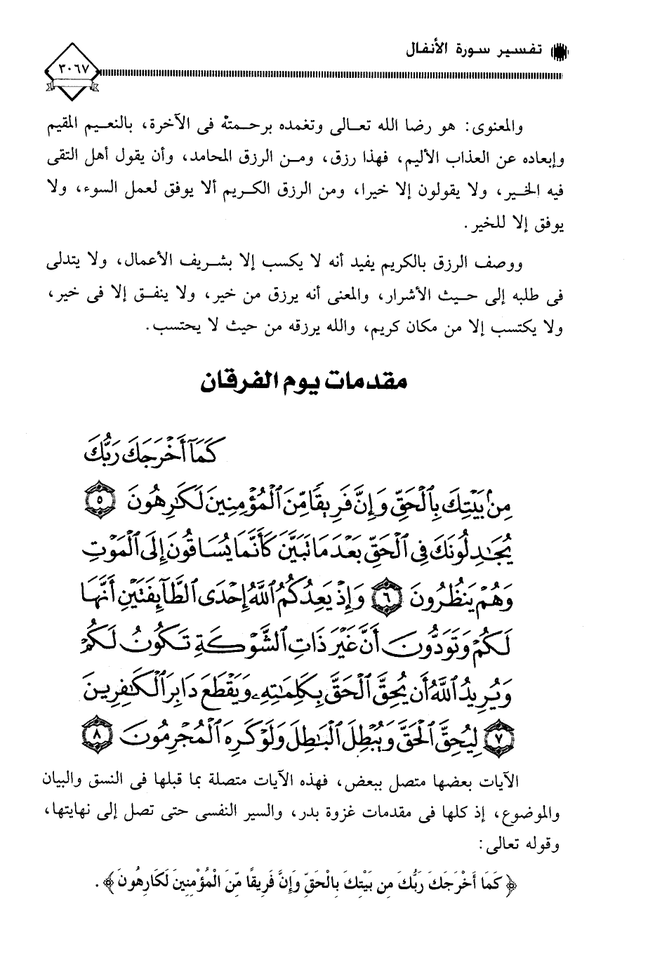 (كَمَا أَخْرَجَكَ رَبُّكَ مِنْ بَيْتِكَ بِالْحَقِّ وَإِنَّ فَرِيقًا مِنَ الْمُؤْمِنِينَ لَكَارِهُونَ (5) يُجَادِلُونَكَ فِي الْحَقِّ بَعْدَمَا تَبَيَّنَ كَأَنَّمَا يُسَاقُونَ إِلَى الْمَوْتِ وَهُمْ يَنْظُرُونَ (6) وَإِذْ يَعِدُكُمُ اللَّهُ إِحْدَى الطَّائِفَتَيْنِ أَنَّهَا لَكُمْ وَتَوَدُّونَ أَنَّ غَيْرَ ذَاتِ الشَّوْكَةِ تَكُونُ لَكُمْ وَيُرِيدُ اللَّهُ أَنْ يُحِقَّ الْحَقَّ بِكَلِمَاتِهِ وَيَقْطَعَ دَابِرَ الْكَافِرِينَ (7) لِيُحِقَّ الْحَقَّ وَيُبْطِلَ الْبَاطِلَ وَلَوْ كَرِهَ الْمُجْرِمُونَ (8)