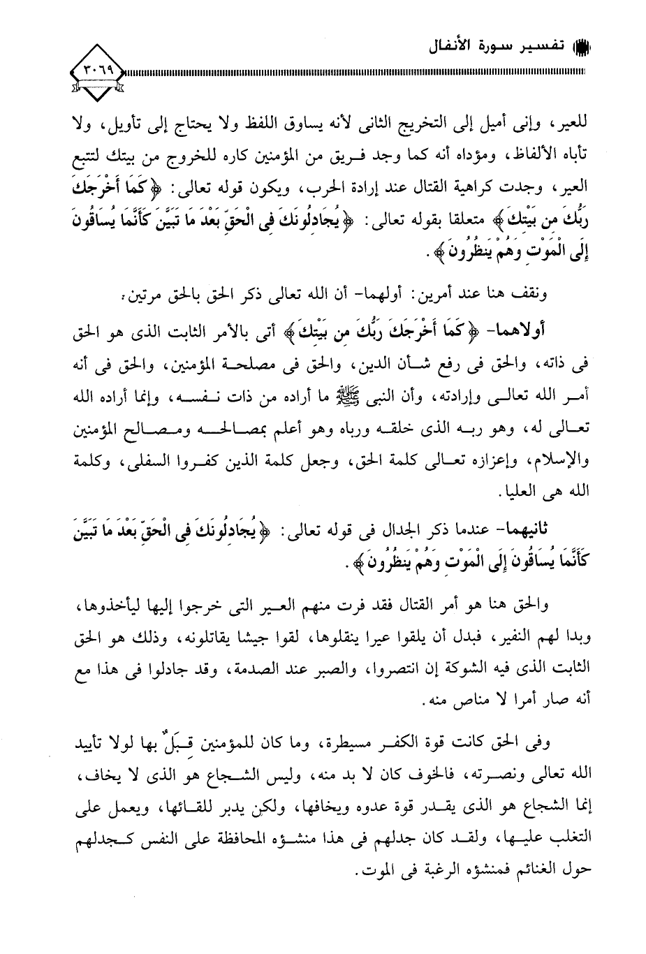 أولاهما - (كَمَا أَخْرَجَكَ رَبُّكَ مِن بَيتِكَ) أتى بالأمر الثابت الذي هو الحق في ذاته، والحق في رفع شأن الدين، والحق في مصلحة المؤمنين، والحق في أنه أمر الله تعالى وإرادته، وأن النبي - صلى الله عليه وسلم - ما أراده من ذات نفسه، وإنما أراده الله تعالى له، وهو ربه الذي خلقه ورباه وهو أعلم بمصالحه ومصالح المؤمنين والإسلام، وإعزازه تعالى كلمة الحق، وجعل كلمة الذين كفروا السفلى، وكلمة الله هي العليا.