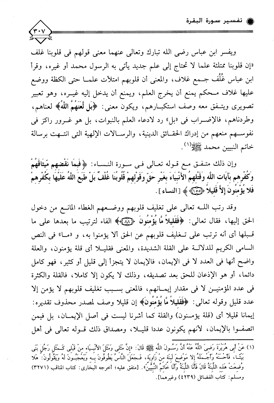 وإن ذلك متفق مع قوله تعالى في سورة النساء: (فَبِمَا نَقْضِهِم مّيثَاقَهُمْ وَكُفْرِهِم بِآيَاتِ اللَّهِ وَقَتْلِهِمُ الأَنْبِيَاءَ بِغَيْرِ حَقٍّ وَقَوْلِهِمْ قُلُوبُنَا غُلْفٌ بَلْ طَبَعَ اللَّهُ عَلَيْهَا بِكُفْرِهِم فَلا يُؤْمِنُونَ إِلَّا قَلِيلًا).