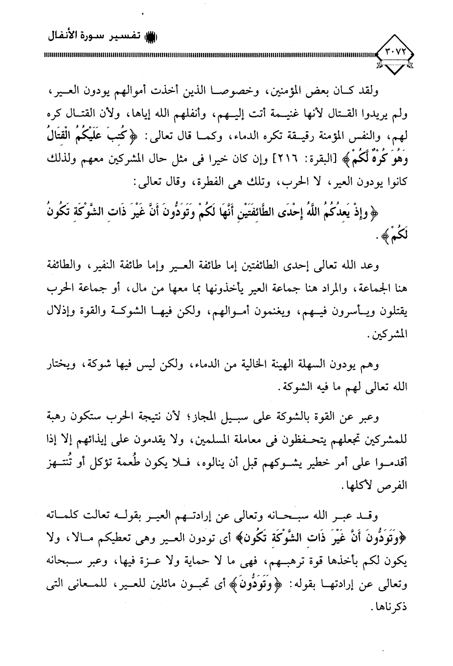وقد عبر الله سبحانه وتعالى عن إرادتهم العير بقوله تعالت كلماته (وَتَوَدُّونَ أَنَّ غَيْرَ ذَاتِ الشَّوْكَةِ تَكون) أي تودون العير وهي تعطيكم مالا، ولا يكون لكم بأخذها قوة ترهبهم، فهي ما لَا حماية ولا عزة فيها، وعبر سبحانه وتعالى عن إرادتها بقوله: (وَتَوَدُّونَ) أي تحبون مائلين للعير، للمعاني التي ذكرناها.