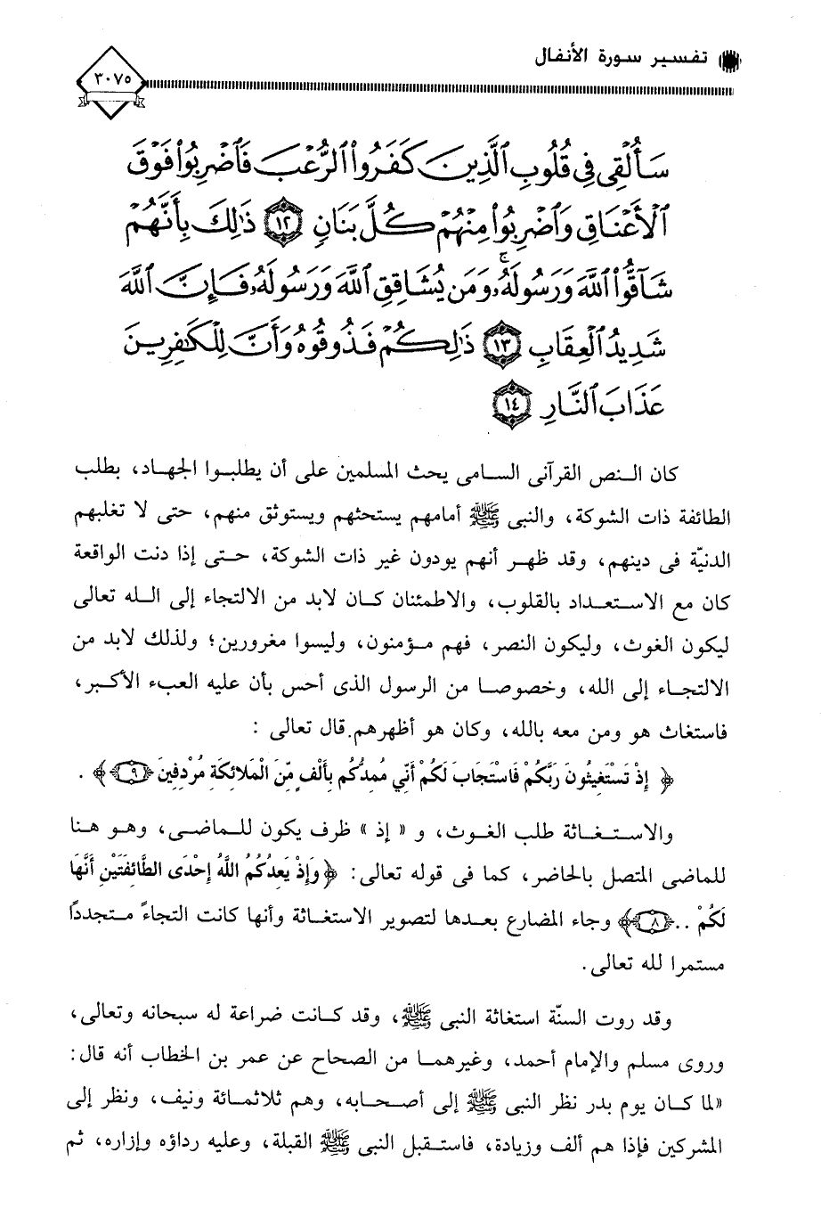 سَأُلْقِي فِي قُلُوبِ الَّذِينَ كَفَرُوا الرُّعْبَ فَاضْرِبُوا فَوْقَ الْأَعْنَاقِ وَاضْرِبُوا مِنْهُمْ كُلَّ بَنَانٍ (12) ذَلِكَ بِأَنَّهُمْ شَاقُّوا اللَّهَ وَرَسُولَهُ وَمَنْ يُشَاقِقِ اللَّهَ وَرَسُولَهُ فَإِنَّ اللَّهَ شَدِيدُ الْعِقَابِ (13) ذَلِكُمْ فَذُوقُوهُ وَأَنَّ لِلْكَافِرِينَ عَذَابَ النَّارِ (14)
