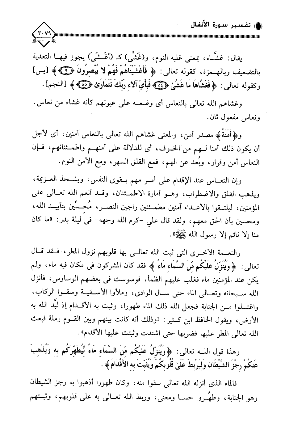 وإن النعاس عند الإقدام على أمر مهم يقوى النفس، ويشحذ العزيمة، ويذهب القلق والاضطراب، وهو أمارة الاطمئنان، وقد أنعم الله تعالى على المؤمنين، ليلتقوا بالأعداء آمنين مطمئنين راجين النصر، مُحِسِّين بتأييد الله، ومحسين بأن الحق معهم، ولقد قال علي - كرم الله وجهه - في ليلة بدر: " ما كان منا إلا نائم إلا رسول الله - صلى الله عليه وسلم -.