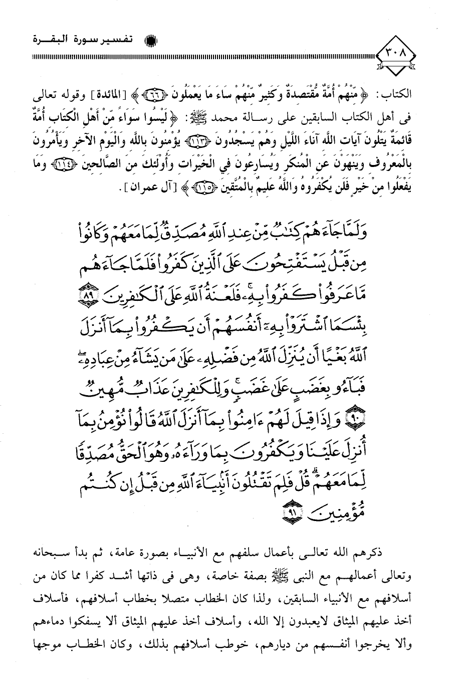 (وَلَمَّا جَاءَهُمْ كِتَابٌ مِنْ عِنْدِ اللَّهِ مُصَدِّقٌ لِمَا مَعَهُمْ وَكَانُوا مِنْ قَبْلُ يَسْتَفْتِحُونَ عَلَى الَّذِينَ كَفَرُوا فَلَمَّا جَاءَهُمْ مَا عَرَفُوا كَفَرُوا بِهِ فَلَعْنَةُ اللَّهِ عَلَى الْكَافِرِينَ (89) بِئْسَمَا اشْتَرَوْا بِهِ أَنْفُسَهُمْ أَنْ يَكْفُرُوا بِمَا أَنْزَلَ اللَّهُ بَغْيًا أَنْ يُنَزِّلَ اللَّهُ مِنْ فَضْلِهِ عَلَى مَنْ يَشَاءُ مِنْ عِبَادِهِ فَبَاءُوا بِغَضَبٍ عَلَى غَضَبٍ وَلِلْكَافِرِينَ عَذَابٌ مُهِينٌ (90) وَإِذَا قِيلَ لَهُمْ آمِنُوا بِمَا أَنْزَلَ اللَّهُ قَالُوا نُؤْمِنُ بِمَا أُنْزِلَ عَلَيْنَا وَيَكْفُرُونَ بِمَا وَرَاءَهُ وَهُوَ الْحَقُّ مُصَدِّقًا لِمَا مَعَهُمْ قُلْ فَلِمَ تَقْتُلُونَ أَنْبِيَاءَ اللَّهِ مِنْ قَبْلُ إِنْ كُنْتُمْ مُؤْمِنِينَ (91) وَلَقَدْ جَاءَكُمْ مُوسَى بِالْبَيِّنَاتِ ثُمَّ اتَّخَذْتُمُ الْعِجْلَ مِنْ بَعْدِهِ وَأَنْتُمْ ظَالِمُونَ (92) وَإِذْ أَخَذْنَا مِيثَاقَكُمْ وَرَفَعْنَا فَوْقَكُمُ الطُّورَ خُذُوا مَا آتَيْنَاكُمْ بِقُوَّةٍ وَاسْمَعُوا قَالُوا سَمِعْنَا وَعَصَيْنَا وَأُشْرِبُوا فِي قُلُوبِهِمُ الْعِجْلَ بِكُفْرِهِمْ قُلْ بِئْسَمَا يَأْمُرُكُمْ بِهِ إِيمَانُكُمْ إِنْ كُنْتُمْ مُؤْمِنِينَ (93)