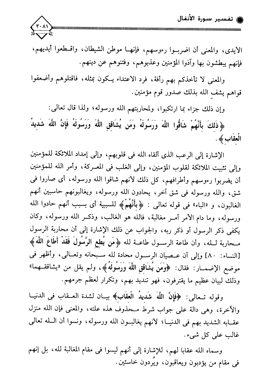 الإشارة إلى الرعب الذي ألقاه الله في قلوبهم، وإلى إمداد الملائكة للمؤمنين وإلى تثبيت الملائكة لقلوب المؤمنين، وإلى الغلب في المعركة، وأمر الله للمؤمنين أن يضربوا رءوسهم وأطرافهم، كل ذلك لأنهم شاقوا الله ورسوله، أي صاروا في شق، والله ورسوله في شق آخر، يحادون الله ورسوله، ويغالبونهم حاسبين أنهم الغالبون، و " الباء " في قوله تعالى: (بِأنَّهُمْ) للسببية أي بسبب أنهم حادوا الله ورسوله، وما دام الأمر أمر مغالبة، فالله هو الغالب، وذكر الله ورسوله، وكان يكفي ذكر الرسول أو ذكر ربه؟ والجواب عن ذلك الإشحارة إلى أن محاربة الرسول حاربة لله، وأن طاعة الرسول طاصة لله (مَن يُطِعِ الرَّسُولَ فَقَدْ أَطَاعَ اللَّهَ)، وإلى أن عصيان الرسول محادة لله سبحانه وتعالى، وأظهر في موضع الإضمار: فقال: (وَمَن ئشَاقِقِ اللَّهَ وَرَسُولَهُ)، ولم يقل من " يشاققهما " وذلك لبيان عظيم ما يقترفون، فهو تنديد بهم، وتكرار لعظم جرمهم.
