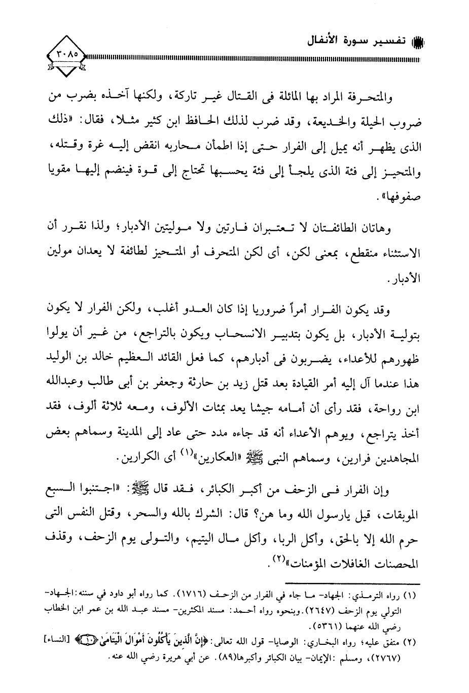 وهاتان الطائفتان لَا تعتبران فارتين ولا موليتين الأدبار، ولذا نقرر أن الاستثناء منقطع، بمعنى لكن، أي لكن التحرف أو المتحيز لطائفة لَا يعدان مولين الأدبار.