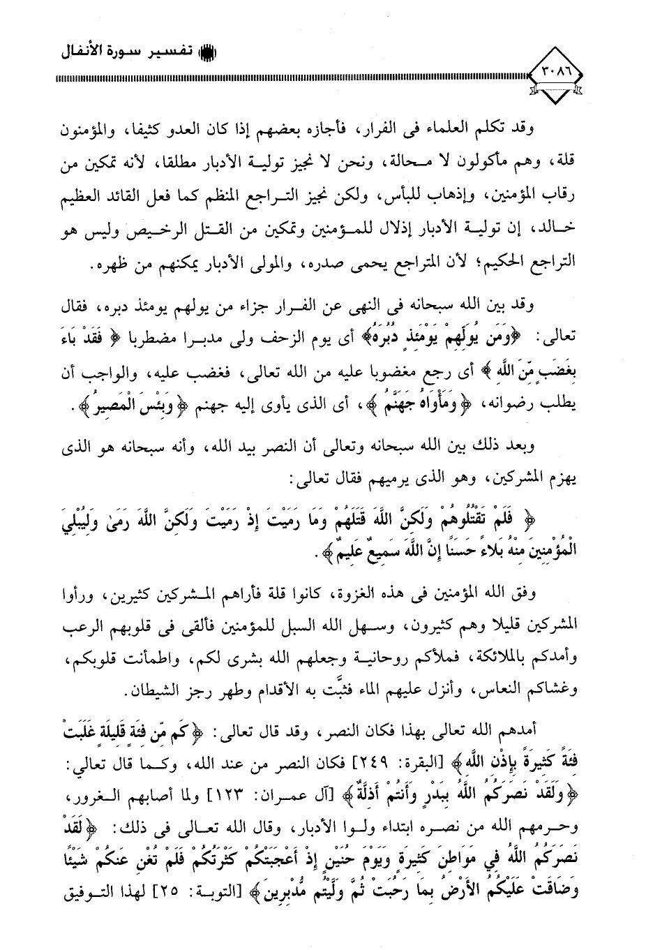 وقد تكلم العلماء في الفرار، فأجازه بعضهم إذا كان العدو كثيفا، والمؤمنون قلة، وهم مأكولون لَا محالة، ونحن لَا نجيز تولية الأدبار مطلقا، لأنه تمكين من رقاب المؤمنين، وإذهاب للبأس، ولكن نجيز التراجع المنظم كما فعل القائد العظيم خالد، إن تولية الأدبار إذلال للمؤمنين وتمكين من القتل الرخيص وليس هو التراجع الحكيم؛ لأن المتراجع يحمي صدره، والمولي الأدبار يمكنهم من ظهره.