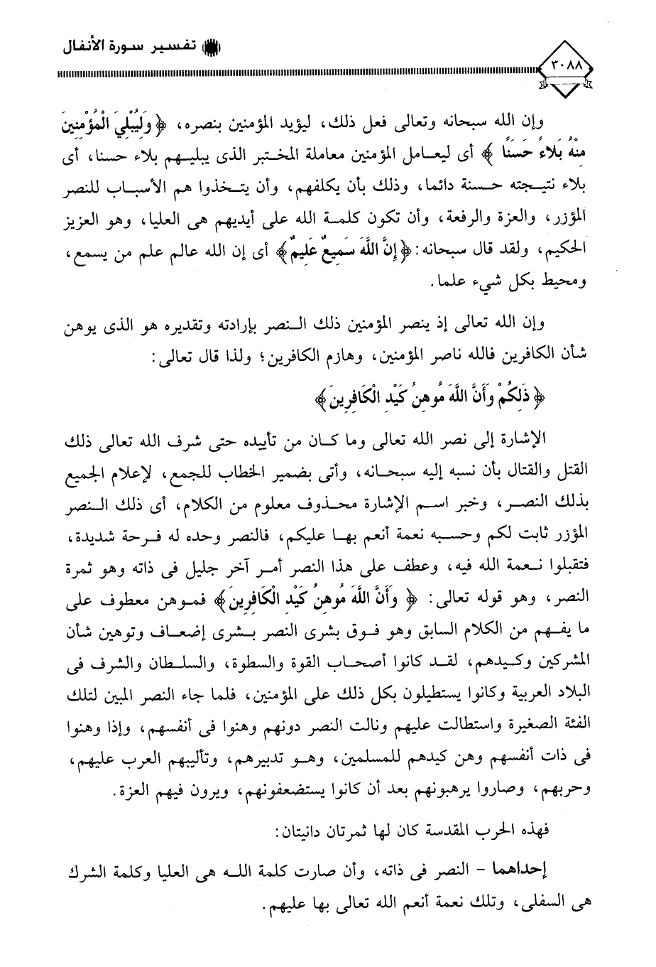 وإن الله سبحانه وتعالى فعل ذلك، ليؤيد المؤمنين بنصره، (وَلِيُبْلِيَ الْمُؤْمِنِينَ مِنْهُ بَلَاءً حَسَنًا) أي ليعامل المؤمنين معاملة المختبر الذي يبليهم بلاء حسنا، أي بلاء نتيجته حسنة دائما، وذلك بأن يكلفهم، وأن يتخذوا هم الأسباب للنصر المؤزر، والعزة والرفعة، وأن تكون كلمة الله على أيديهم هي العليا، وهو العزيز الحكيم، ولقد قال سبحانه: (إِنَّ اللَّهُ سَمِيعٌ عَلِيمٌ) أي إن الله عالم علم من يسمع، ومحيط بكل شيء علما.