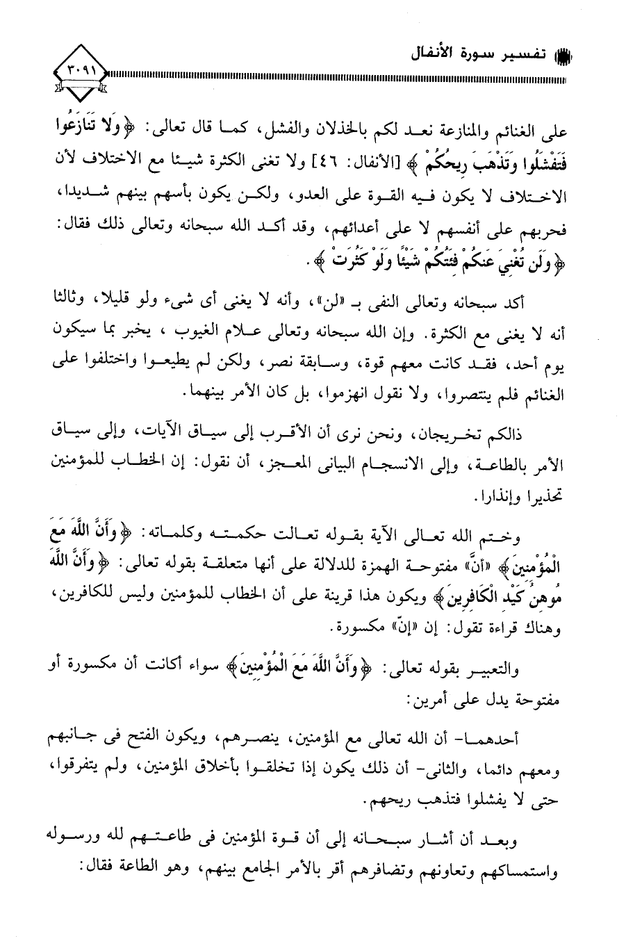 على الغنائم والمنازعة نعد لكم بالخذلان والفشل، كما قال تعالى: (وَلا تَنَازَعُوا فَتَفْشَلُوا وَتَذْهَبَ رِيحُكُمْ)، ولا تغني الكثرة شيئا مع الاختلاف لأن الاختلاف لَا يكون فيه القوة على العدو، ولكن يكون بأسهم بينهم شديدا، فحربهم على أنفسهم لَا على أعدائهم، وقد أكد الله سبحانه وتعالى ذلك فقال: (وَلَن تُغْنِيَ عَنكُمْ فِئَتُكُمْ شَيْئًا وَلَوْ كَثُرَتْ).