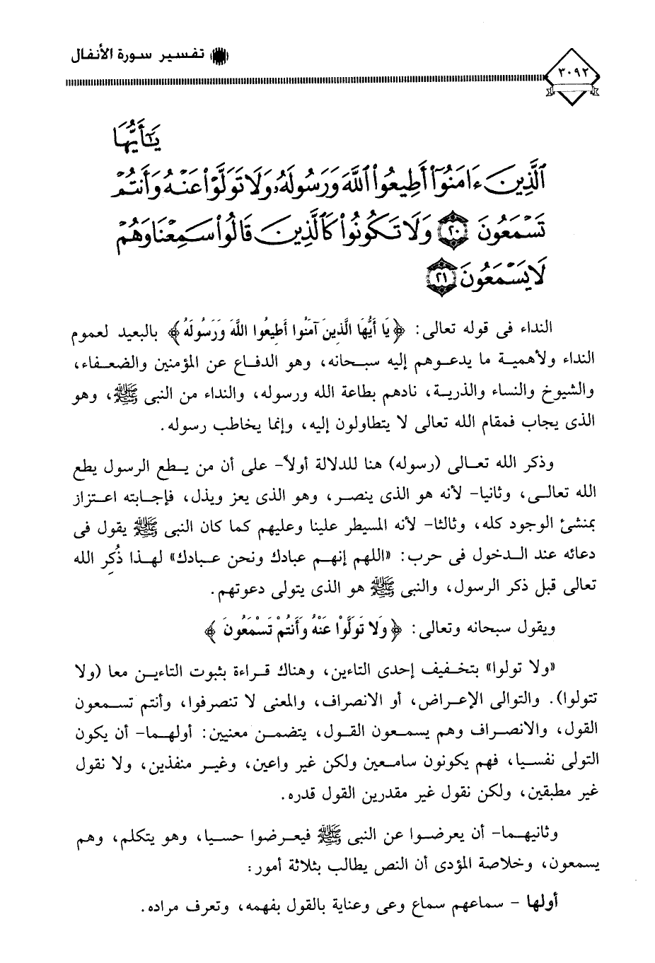 (يَا أَيُّهَا الَّذِينَ آمَنُوا أَطِيعُوا اللَّهَ وَرَسُولَهُ وَلَا تَوَلَّوْا عَنْهُ وَأَنْتُمْ تَسْمَعُونَ (20) وَلَا تَكُونُوا كَالَّذِينَ قَالُوا سَمِعْنَا وَهُمْ لَا يَسْمَعُونَ (21)