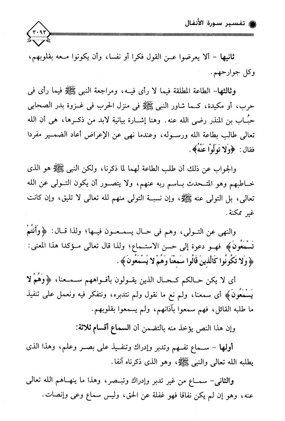 وثالثها - الطاعة المطلقة فيما لَا رأي فيه، ومراجعة النبي - صلى الله عليه وسلم - فيما رأى في حرب، أو مكيدة، كما شاور النبي - صلى الله عليه وسلم - في منزل الحرب في غزوة بدر الصحابي حبُاب بن المنذر رضي الله عنه. وهنا إشارة بيانية لابد من ذكرها، هي أن الله تعالى طالب بطاعة الله ورسوله، وعندما نهى عن الإعراض أعاد الضمير مفردا فقال: (وَلا تَوَلَّوْا عَنْهُ).