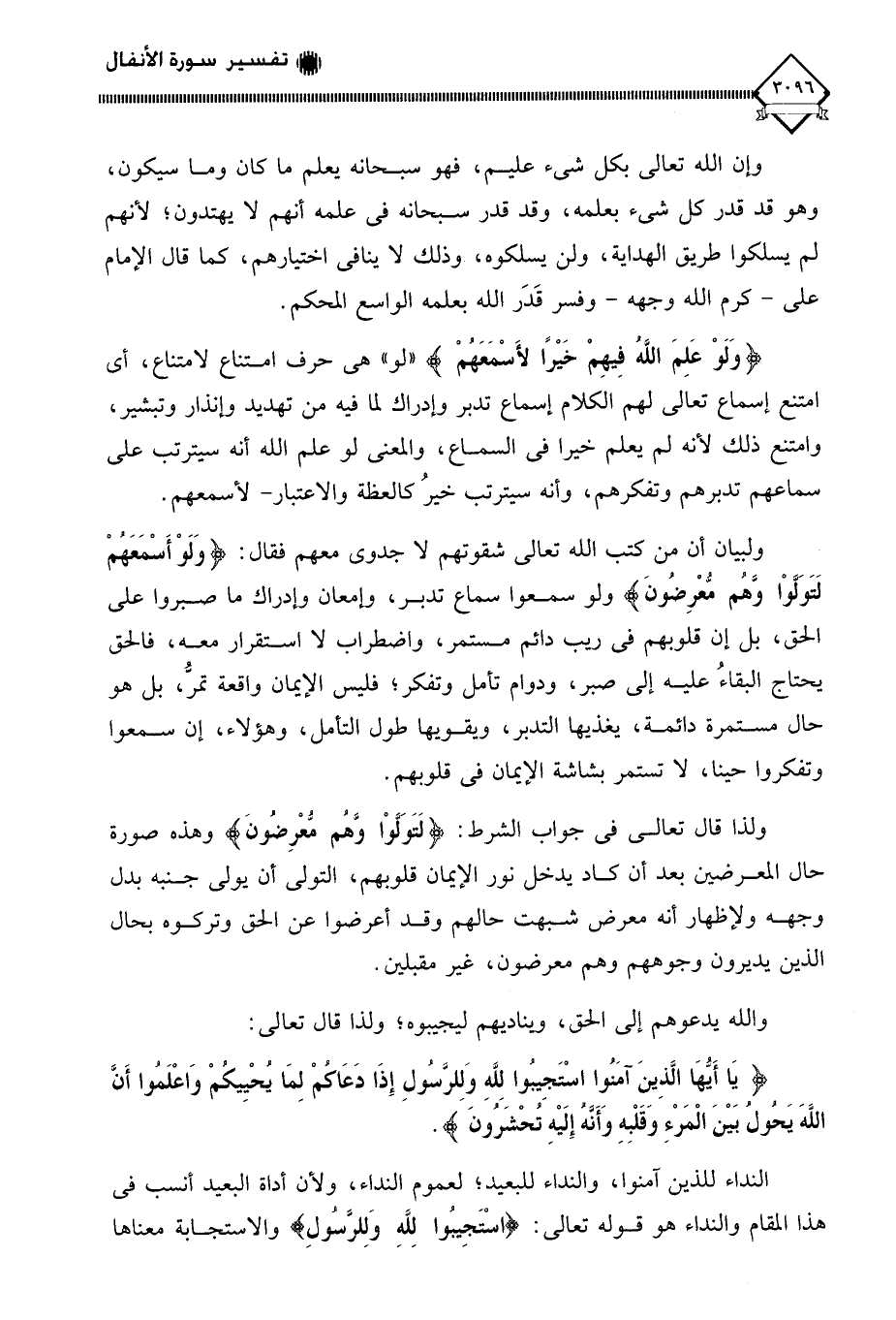 (وَلَوْ عَلِمَ اللَّهُ فِيهِمْ خَيْرًا لأَسْمَعَهُمْ) " لو " هي حرف امتناع لامتناع، أي امتنع إسماع تعالى لهم الكلام إسماع تدبر وإدراك لما فيه من تهديد وإنذار وتبشير، وامتنع ذلك لأنه لم يعلم خيرا في السماع، والمعنى لو علم الله أنه سيترتب على سماعهم تدبرهم وتفكرهم، وأنه سيترتب خير كالعظة والاعتبار - لأسمعهم ولبيان أن من كتب الله تعالى شقوتهم لَا جدوى معهم فقال: (وَلَوْ أَسْمَعَهُمْ لَتَوَلَّوْا وهُم مُّعْرِضونَ) ولو سمعوا سماع تدبر، وإمعان وإدراك ما صبروا على الحق، بل إن قلوبهم في ريب دائم مستمر، واضطراب لَا استقرار معه، فالحق يحتاج البقاءُ عليه إلى صبر، ودوام تأمل وتفكر؛ فليس الإيمان واقعة تمر، بل هو حال مستمرة دائمة، يغذيها التدبر، ويقويها طول التأمل، وهؤلاء، إن سمعوا وتفكروا حينا، لَا تستمر بشاشة الإيمان في قلوبهم.