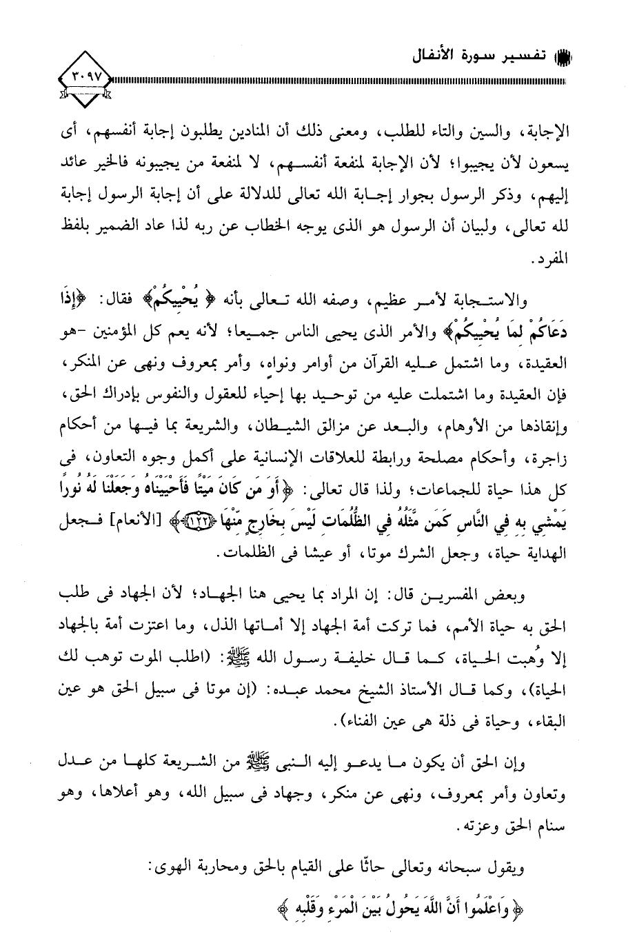 وبعض المفسرين قال: إن المراد بما يحيي هنا الجهاد؛ لأن الجهاد في طلب الحق به حياة الأمم، فما تركت أمة الجهاد إلا أماتها الذل، وما اعتزت أمة بالجهاد إلا وُهبت الحياة، كما قال خليفة رسول الله - صلى الله عليه وسلم -: (اطلب الموت توهب لك الحياة)، وكما قال الأستاذ الشيخ محمد عبده: (إن موتا في سبيل الحق هو عين البقاء، وحياة في ذلة هي عين الفناء).