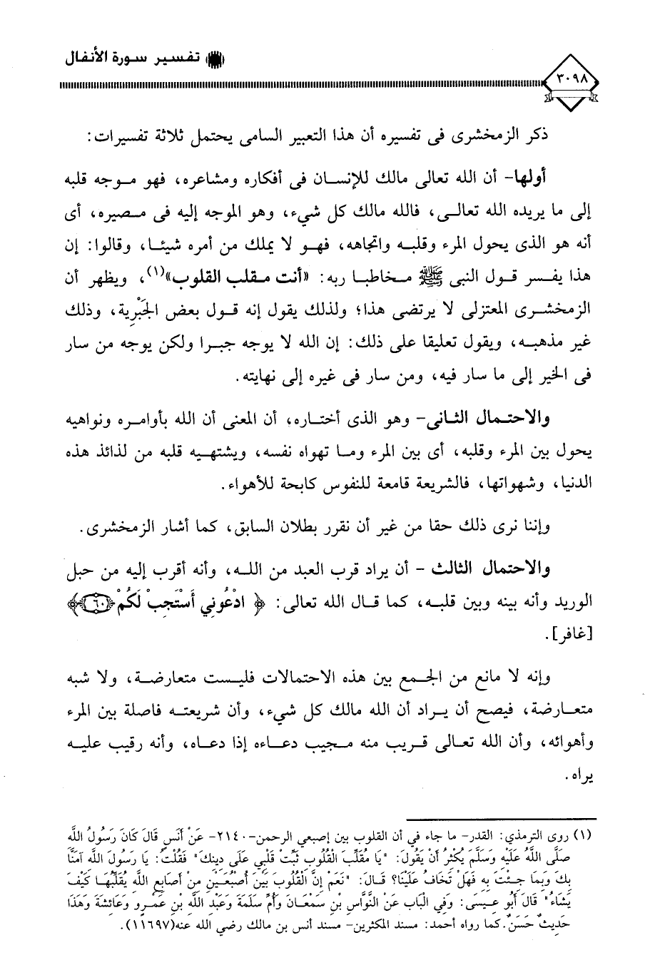 ذكر الزمخشري في تفسيره أن هذا التعبير السامي يحتمل ثلاثة تفسيرات: أولهما - أن الله تعالى مالك للإنسان في أفكاره ومشاعره، فهو موجه قلبه إلى ما يريده الله تعالى، فالله مالك كل شيء، وهو الموجه إليه في مصيره، أي أنه هو الذي يحول المرء وقلبه واتجاهه، فهو لَا يملك من أمره شيئا، وقالوا: إن هذا يفسر قول النبي - صلى الله عليه وسلم - مخاطبا ربه: " أنت مقلب القلوب " (¬1)، ويظهر أن الزمخشري المعتزلي لَا يرتضي هذا؛ ولذلك يقول إنه قول بعض الجَبْرِية، وذلك غير مذهبه، ويقول تعليقا على ذلك: إن الله لَا يوجه جبرا ولكن يوجه من سار في الخير إلى ما سار فيه، ومن سار في غيره إلى نهايته.