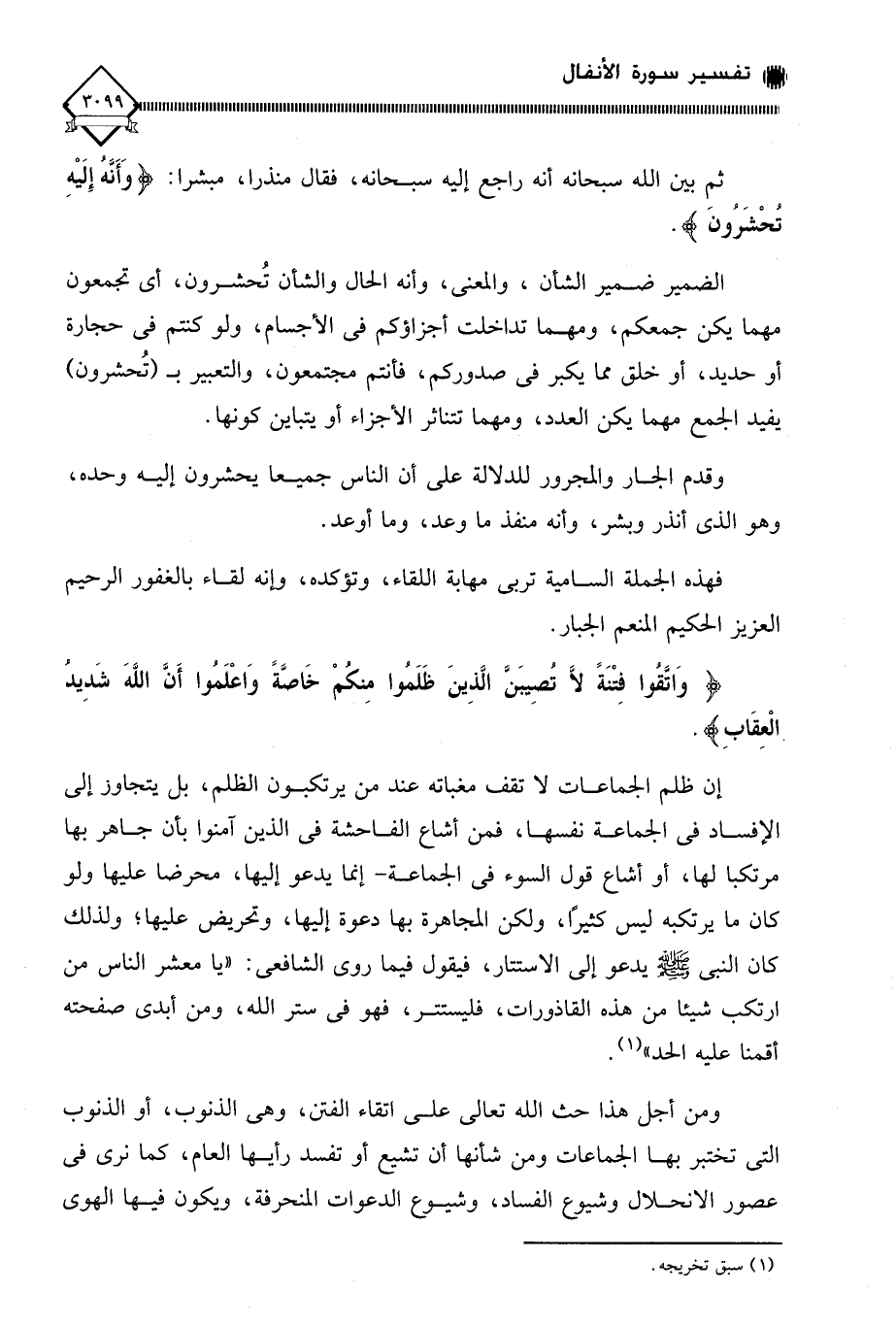 ومن أجل هذا حث الله تعالى على اتقاء الفتن، وهي الذنوب، أو الذنوب التي تختبر بها الجماعات ومن شأنها أن تشيع أو تفسد رأيها العام، كما نرى في عصور الانحلال وشيوع الفساد، وشيوع الدعوات المنحرفة، ويكون فيها الهوى