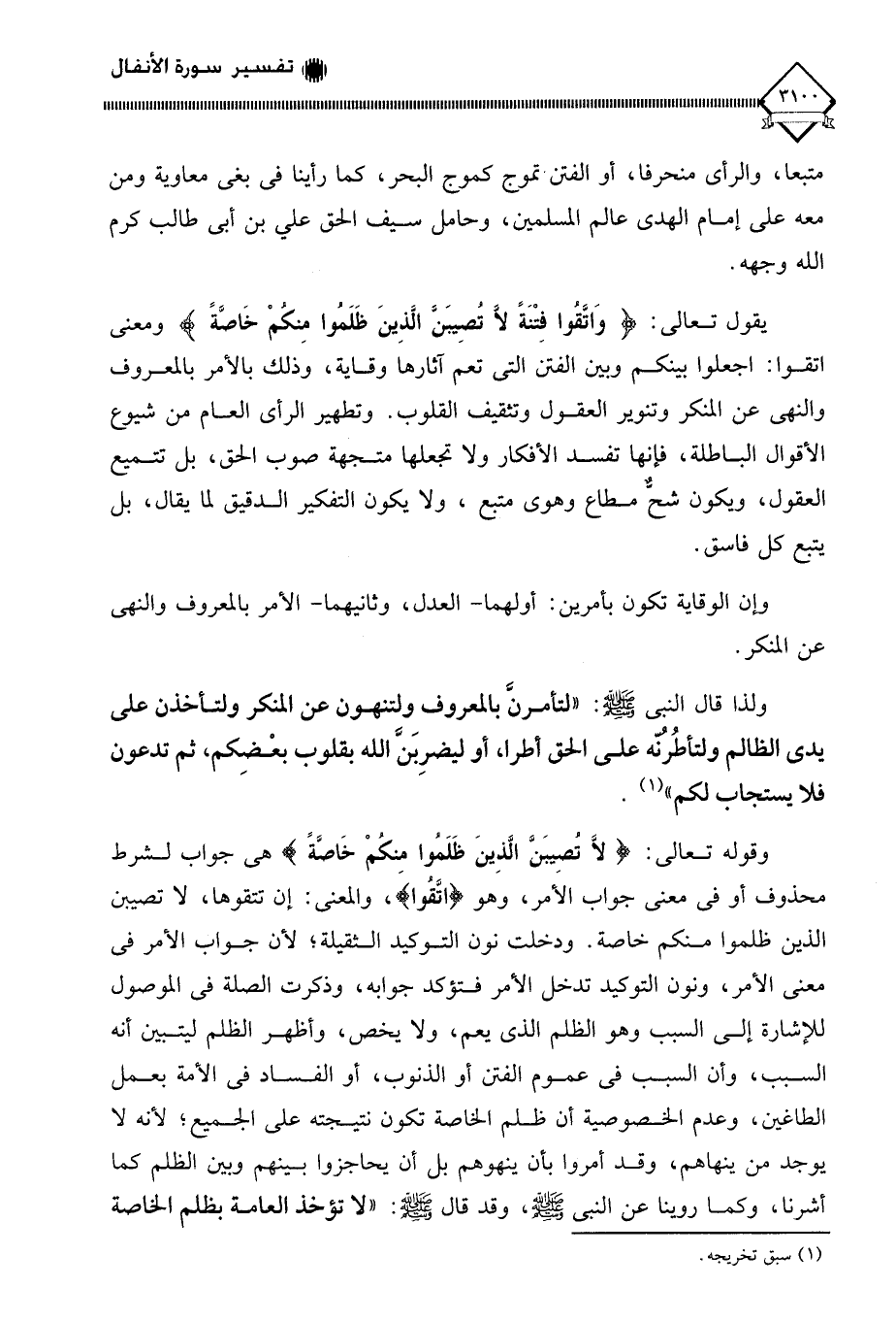 يقول تعالى: (وَاتَّقوا فِتْنَةً لَا تُصِيبَنَّ الَّذِينَ ظَلَمُوا مِنكُمْ خَاصَّةً) ومعنى اتقوا: اجعلوا بينكم وبين الفتن التي تعم آثارها وقاية، وذلك بالأمر بالمعروف والنهي عن المنكر وتنوير العقول وتثقيف القلوب. وتطهير الرأي العام من شيوع الأقوال الباطلة، فإنها تفسد الأفكار ولا تجعلها متجهة صوب الحق، بل تتميع العقول، ويكون شح مطاع وهوى متبع، ولا يكون التفكير الدقيق لما يقال، بل يتبع كل فاسق.