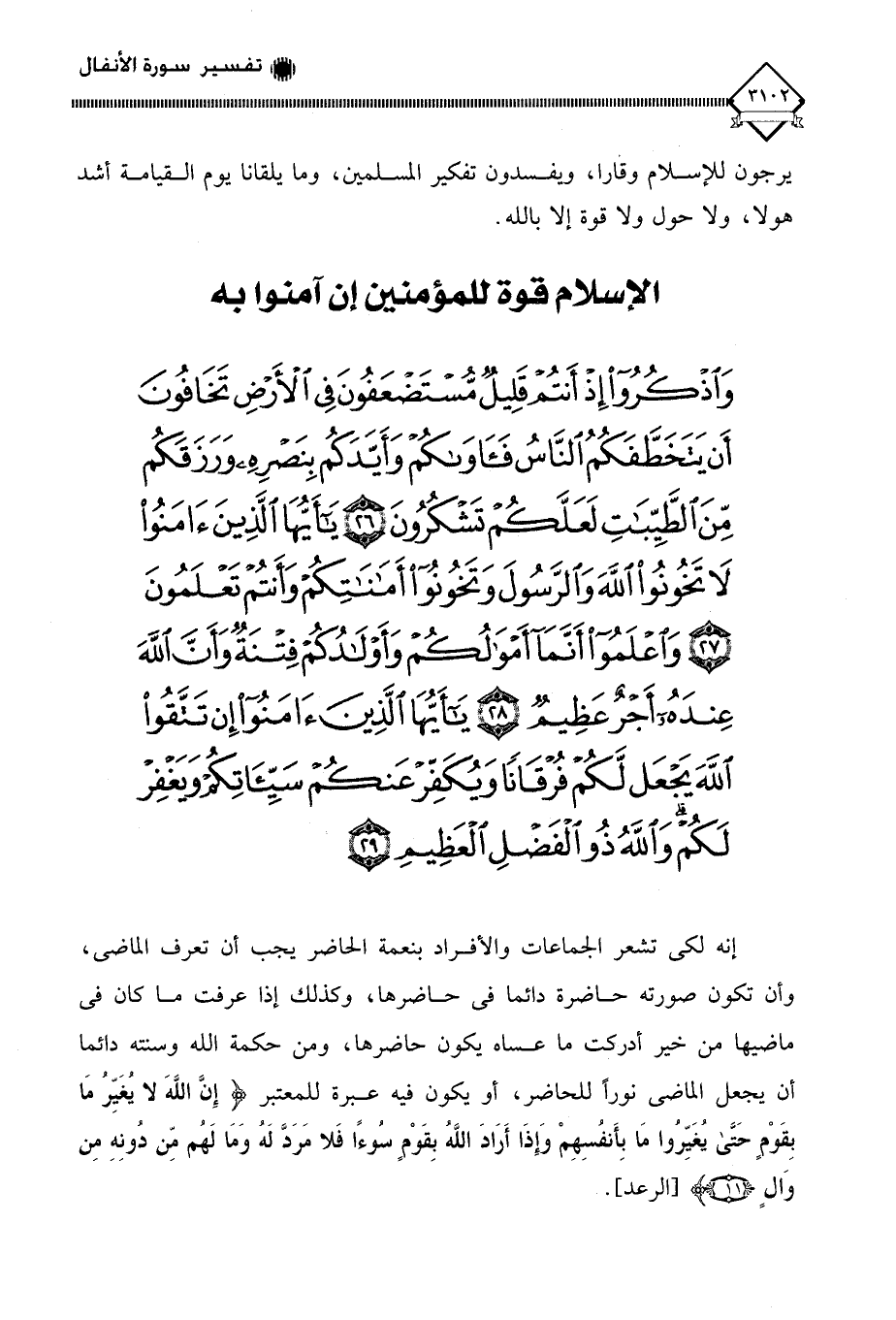 (وَاذْكُرُوا إِذْ أَنْتُمْ قَلِيلٌ مُسْتَضْعَفُونَ فِي الْأَرْضِ تَخَافُونَ أَنْ يَتَخَطَّفَكُمُ النَّاسُ فَآوَاكُمْ وَأَيَّدَكُمْ بِنَصْرِهِ وَرَزَقَكُمْ مِنَ الطَّيِّبَاتِ لَعَلَّكُمْ تَشْكُرُونَ (26) يَا أَيُّهَا الَّذِينَ آمَنُوا لَا تَخُونُوا اللَّهَ وَالرَّسُولَ وَتَخُونُوا أَمَانَاتِكُمْ وَأَنْتُمْ تَعْلَمُونَ (27) وَاعْلَمُوا أَنَّمَا أَمْوَالُكُمْ وَأَوْلَادُكُمْ فِتْنَةٌ وَأَنَّ اللَّهَ عِنْدَهُ أَجْرٌ عَظِيمٌ (28) يَا أَيُّهَا الَّذِينَ آمَنُوا إِنْ تَتَّقُوا اللَّهَ يَجْعَلْ لَكُمْ فُرْقَانًا وَيُكَفِّرْ عَنْكُمْ سَيِّئَاتِكُمْ وَيَغْفِرْ لَكُمْ وَاللَّهُ ذُو الْفَضْلِ الْعَظِيمِ (29)