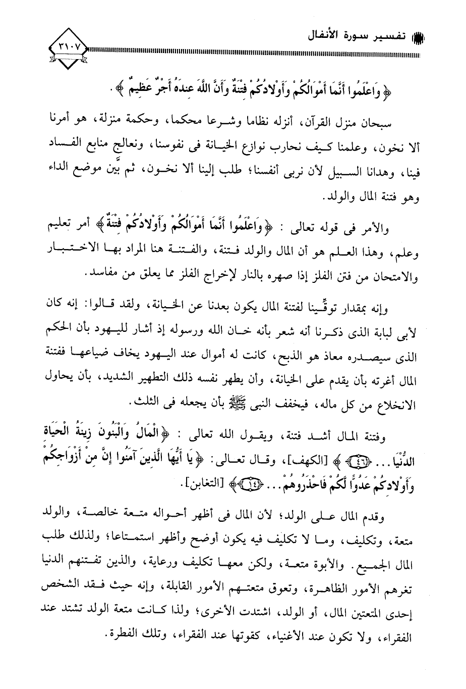 (وَاعْلَمُوا أَنَّمَا أَمْوَالُكُمْ وَأَوْلَادُكُمْ فِتْنَةٌ وَأَنَّ اللَّهَ عِنْدَهُ أَجْرٌ عَظِيمٌ (28)