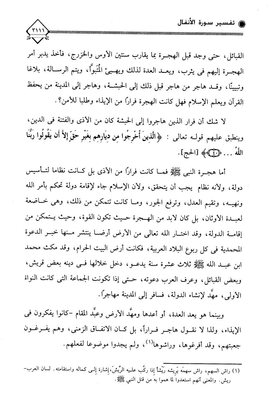 القبائل، حتى وجد قبل الهجرة بما يقارب سنتين الأوس والخزرج، فأخذ يدبر أمر الهجرة إليهم في يثرب، ويعد العدة لذلك ويهيئ المُتَبوَّأ، ويتم الرسالة، بلاغا وتبيينًا، وقد هاجر من هاجر قبل ذلك إلى الحبشة، وهاجر إلى المدينة من يحفظ القرآن ويعلم الإسلام فهل كانت الهجرة فرارًا من الإيذاء وطلبا للأمن؟.