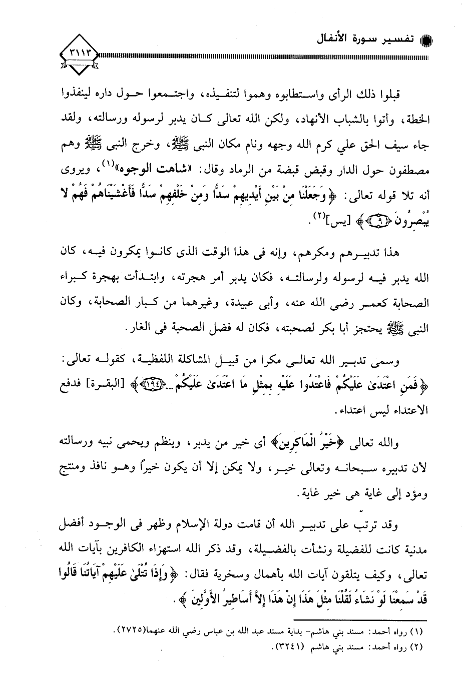 هذا تدبيرهم ومكرهم، وإنه في هذا الوقت الذي كانوا يمكرون فيه، كان الله يدبر فيه لرسوله ولرسالته، فكان يدبر أمر هجرته، وابتدأت بهجرة كبراء الصحابة كعمر رضي الله عنه، وأبي عبيدة، وغيرهما من كبار الصحابة، وكان النبي - صلى الله عليه وسلم - يحتجز أبا بكر لصحبته، فكان له فضل الصحبة في الغار.