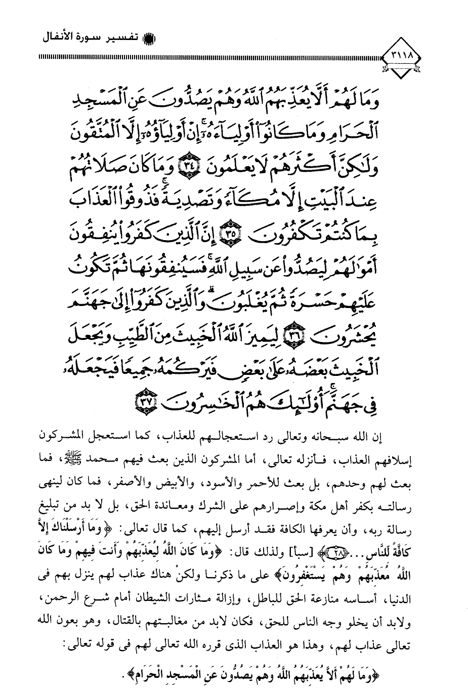 (وَمَا لَهُمْ أَلَّا يُعَذِّبَهُمُ اللَّهُ وَهُمْ يَصُدُّونَ عَنِ الْمَسْجِدِ الْحَرَامِ وَمَا كَانُوا أَوْلِيَاءَهُ إِنْ أَوْلِيَاؤُهُ إِلَّا الْمُتَّقُونَ وَلَكِنَّ أَكْثَرَهُمْ لَا يَعْلَمُونَ (34) وَمَا كَانَ صَلَاتُهُمْ عِنْدَ الْبَيْتِ إِلَّا مُكَاءً وَتَصْدِيَةً فَذُوقُوا الْعَذَابَ بِمَا كُنْتُمْ تَكْفُرُونَ (35) إِنَّ الَّذِينَ كَفَرُوا يُنْفِقُونَ أَمْوَالَهُمْ لِيَصُدُّوا عَنْ سَبِيلِ اللَّهِ فَسَيُنْفِقُونَهَا ثُمَّ تَكُونُ عَلَيْهِمْ حَسْرَةً ثُمَّ يُغْلَبُونَ وَالَّذِينَ كَفَرُوا إِلَى جَهَنَّمَ يُحْشَرُونَ (36) لِيَمِيزَ اللَّهُ الْخَبِيثَ مِنَ الطَّيِّبِ وَيَجْعَلَ الْخَبِيثَ بَعْضَهُ عَلَى بَعْضٍ فَيَرْكُمَهُ جَمِيعًا فَيَجْعَلَهُ فِي جَهَنَّمَ أُولَئِكَ هُمُ الْخَاسِرُونَ (37)