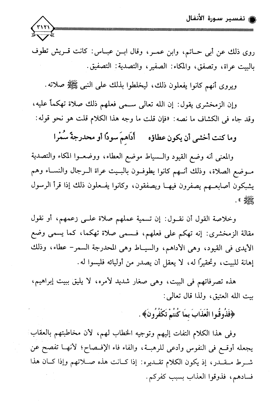 وإن الزمخشري يقول: إن الله تعالى سمى فعلهم ذلك صلاة تهكما عليه، وقد جاء في الكشاف ما نصه: " فإن قلت ما وجه هذا الكلام قلت هو نحو قوله: وما كنت أخشى أن يكون عطاؤه ... أدَاهِمَ سودًا أو محدرجةً سُمْرا والمعنى أنه وضع القيود والسياط موضع العطاء، ووضعوا المكاء والتصدية موضع الصلاة، وذلك أنهم كانوا يطوفون بالبيت عراة الرجال والنساء وهم يشبكون أصابعهم يصفرون فيها ويصفقون، وكانوا يفعلون ذلك إذا قرأ الرسول - صلى الله عليه وسلم -. وخلاصة القول أن نقول: إن تسمية عملهم صلاة على زعمهم، أو نقول مقالة الزمخشري: إنه تهكم على فعلهم، فسمى صلاة تهكما، كما يسمى وضع الأيدي في القيود، وهي الأداهم، والسياط وهي المحدرجة السمر - عطاء، وذلك إهانة للبيت، وتحقيرًا له، لَا يعقل أن يصدر من أوليائه فليسوا له.