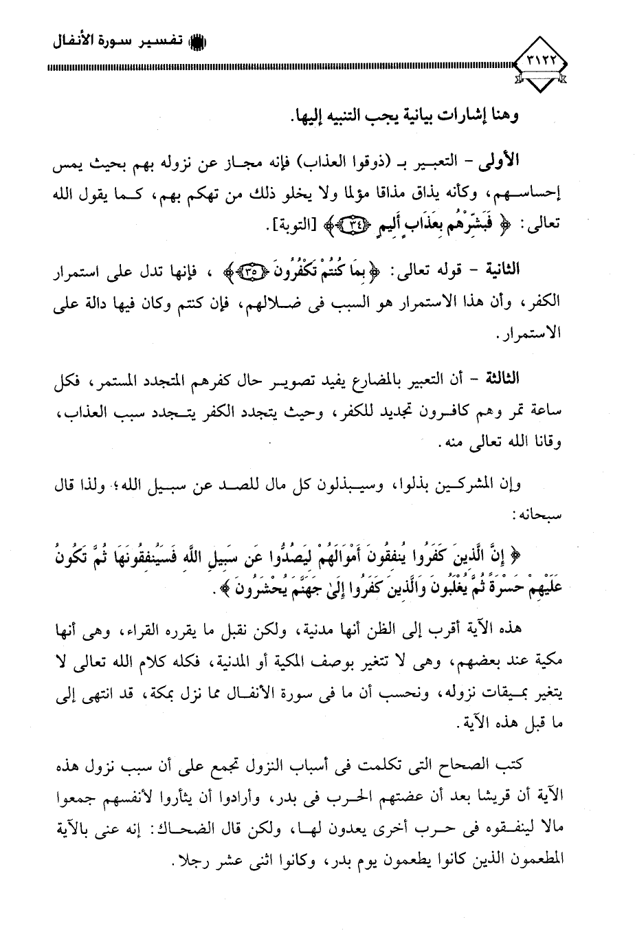الثالثة - أن التعبير بالمضارع يفيد تصوير حال كفرهم المتجدد المستمر، فكل ساعة تمر وهم كافرون تجديد للكفر، وحيث يتجدد الكفر يتجدد سبب العذاب، وقانا الله تعالى منه.