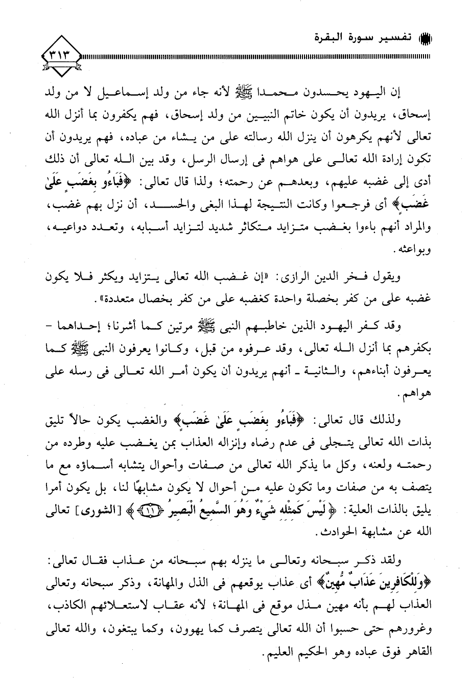 ولذلك قال تعالى: (فَبَاءُو بِغَضَبٍ عَلَى غَضبٍ) والغضب يكون حالا تليق بذات الله تعالى يتجلى في عدم رضاه وإنزاله العذاب بمن يغضب عليه وطرده من رحمته ولعنه، وكل ما يذكر الله تعالى من صفات وأحوال يتشابه أسماؤه مع ما يتصف به من صفات وما تكون عليه من أحوال لَا يكون مشابهًا لنا، بل يكون أمرا يليق بالذات العلية: (لَيْسَ كَمِثْلِهِ شَيْءٌ وهوَ السَّمِيع الْبَصِير)، تعالى الله عن مشابهة الحوادث.