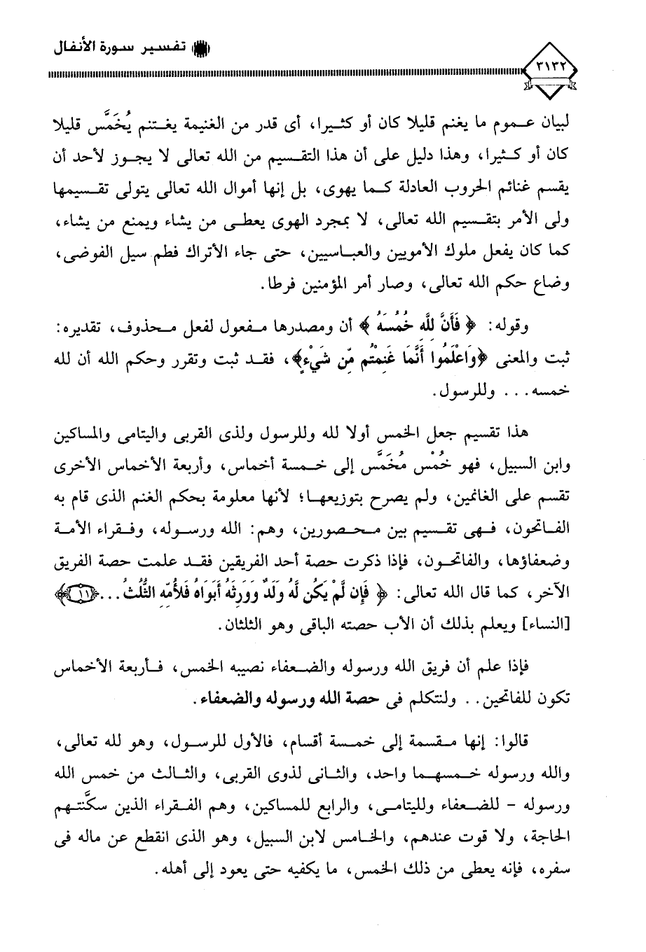 هذا تقسيم جعل الخمس أولا لله وللرسول ولذي القربى واليتامى والمساكين وابن السبيل، فهو خُمْس مُخَمَّس إلى خمسة أخماس، وأربعة الأخماس الأخرى تقسم على الغانمين، ولم يصرح بتوزيعها؛ لأنها معلومة بحكم الغنم الذي قام به الفاتحون، فهي تقسيم بين محصورين، وهم: الله ورسوله، وفقراء الأمة وضعفاؤها، والفاتحون، فإذا ذكرت حصة أحد الفريقين فقد علمت حصة الفريق الآخر، كما قال الله تعالى: (فَإِن لَّمْ يَكُن لَّهُ وَلَدٌ وَوَرِثَهُ أَبَوَاهُ فَلأُمِّهِ الثُلُثُ. . .). ويعلم بذلك أن الأب حصته الباقي وهو الثلثان.